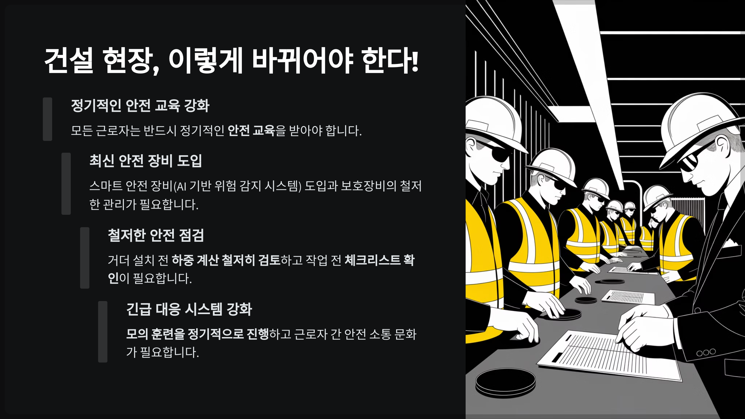 건설 현장의 안전 점검 강화, 근로자 교육 확대, 최신 안전 기술 도입 등이 필수적입니다.