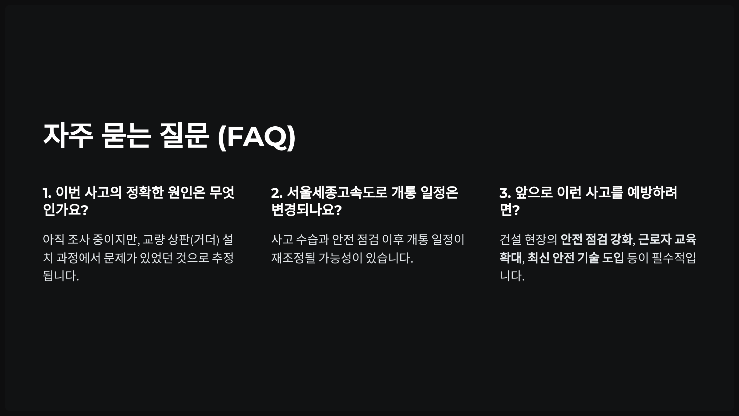대형 공사 현장에서 안전 문제는 늘 반복되는 숙제입니다. 서울세종고속도로뿐만 아니라, 이전에도 여러 차례 교량 붕괴, 터널 붕괴, 크레인 전복 사고 등이 발생해 왔습니다.