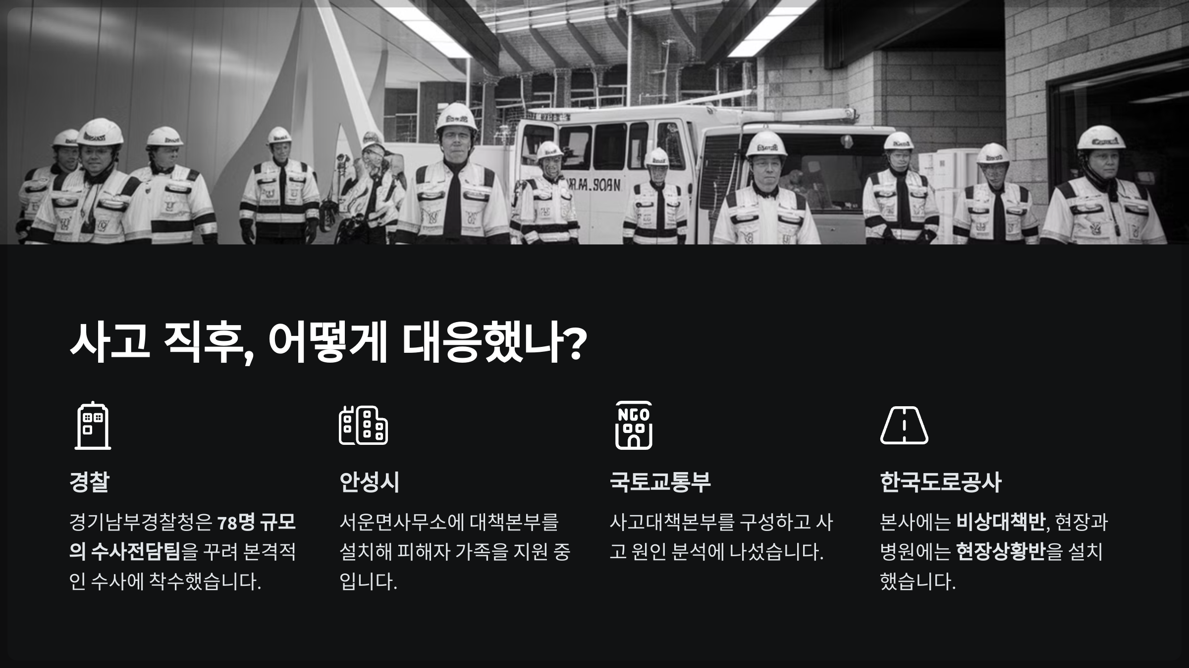 - 한국도로공사: 본사에는 비상대책반, 현장과 병원에는 현장상황반을 설치해 사고 대응에 집중하고 있습니다.