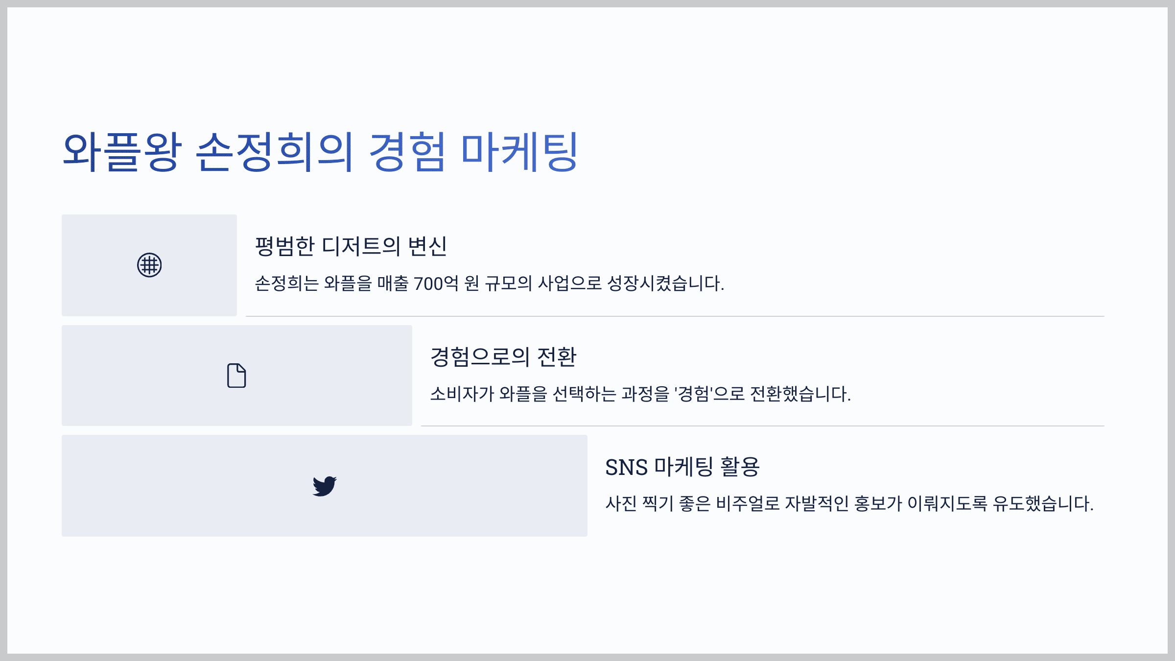 소비자 입장에서는 특별한 맛과 디자인을 체험하는 것이 즐겁고, 이를 주변에 알리는 것도 하나의 놀이 문화가 된다. 손정희가 “와플이 아닌, 즐거운 추억을 판다”라고 말한 이유가 여기에 있다. 먹거리 시장에서도 경험 가치가 부가가치를 크게 높인다는 사실을 이 사례가 증명한다.