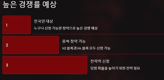 - H3 블록과 H4 블록 중복 청약 가능, 당첨 확률을 높이기 위해 전략적으로 신청하는 것이 중요하다.