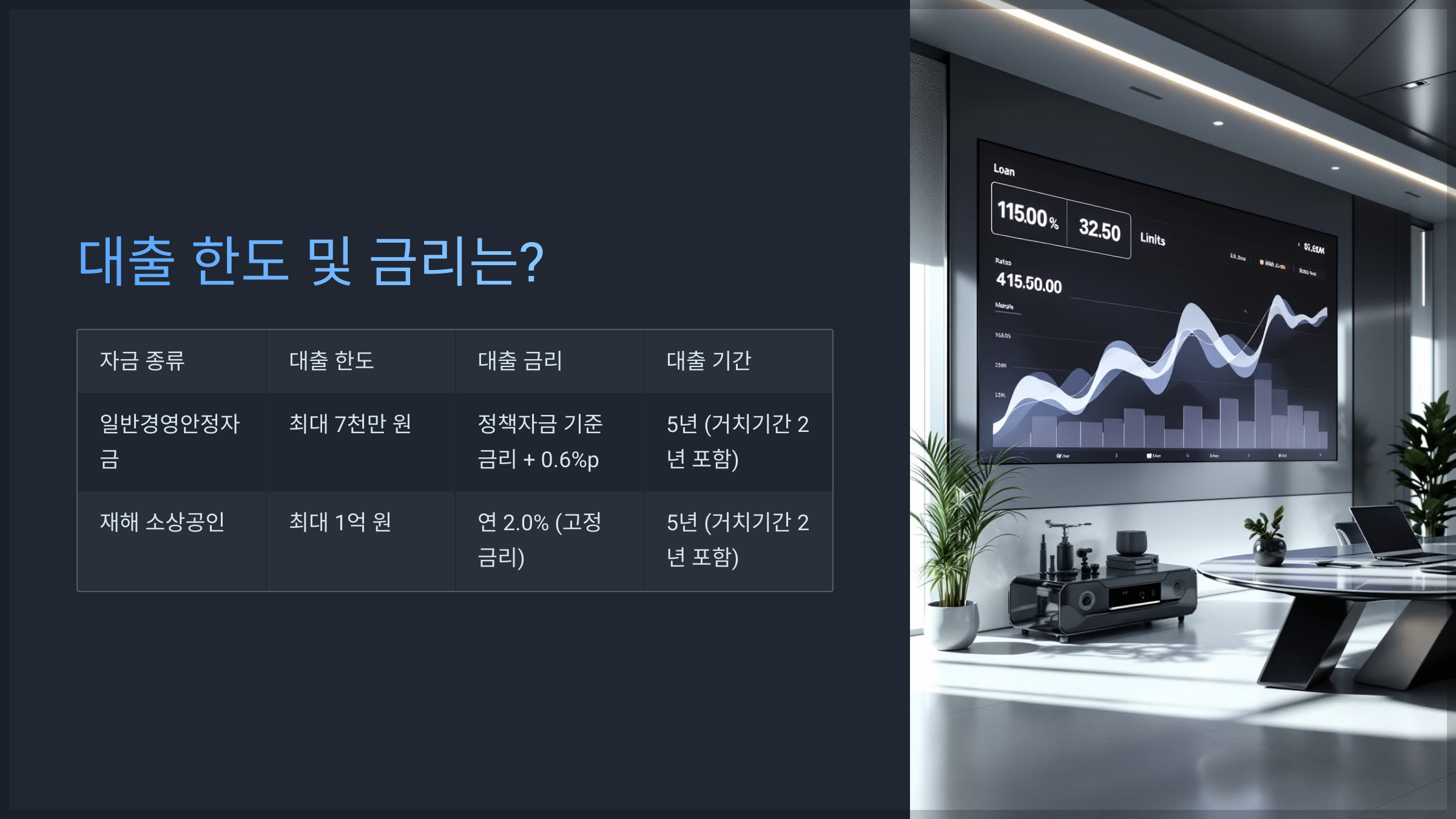 | 재해 소상공인 | 최대 1억 원 | 연 2.0% (고정금리) | 5년 (거치기간 2년 포함) |