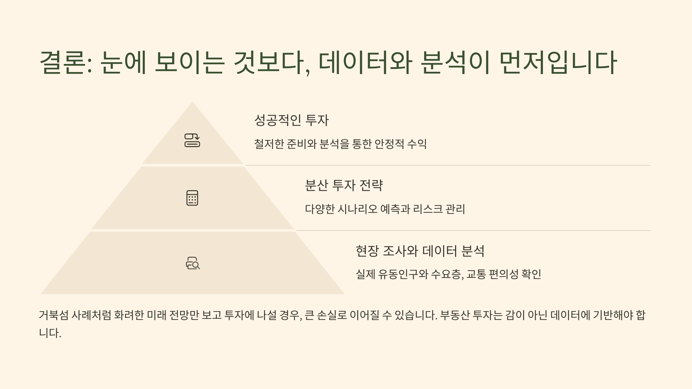거북섬 사례처럼 화려한 미래 전망만 보고 투자에 나설 경우, 큰 손실로 이어질 수 있습니다. 특히 상가 투자는 주거용 부동산보다 변수와 리스크가 많기 때문에, 실제 유동인구와 수요층, 교통 편의성 등을 객관적으로 파악해야 합니다.