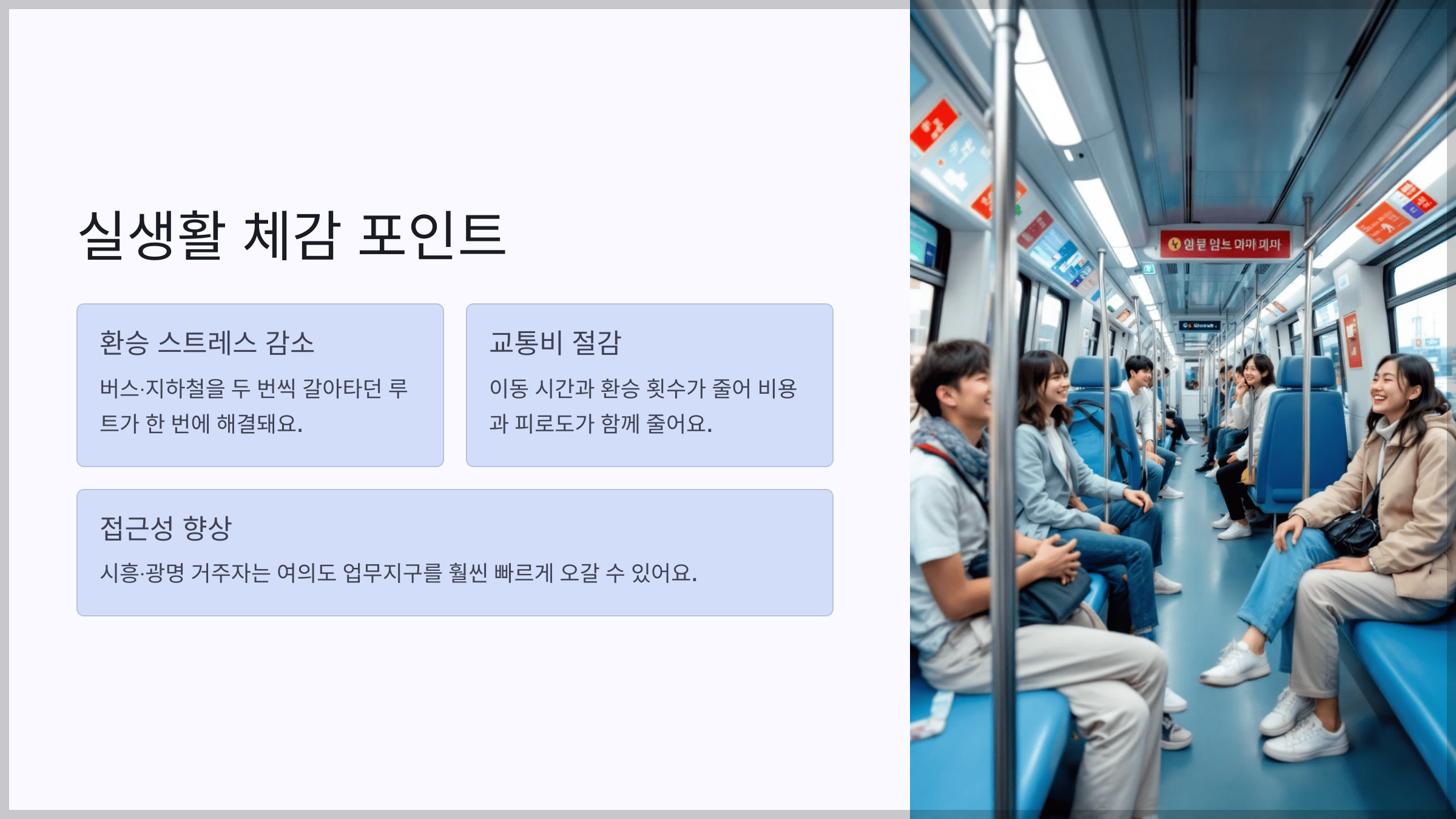 - 교통비 절감: 이동 시간과 환승 횟수가 줄어 비용과 피로도가 함께 줄어요.