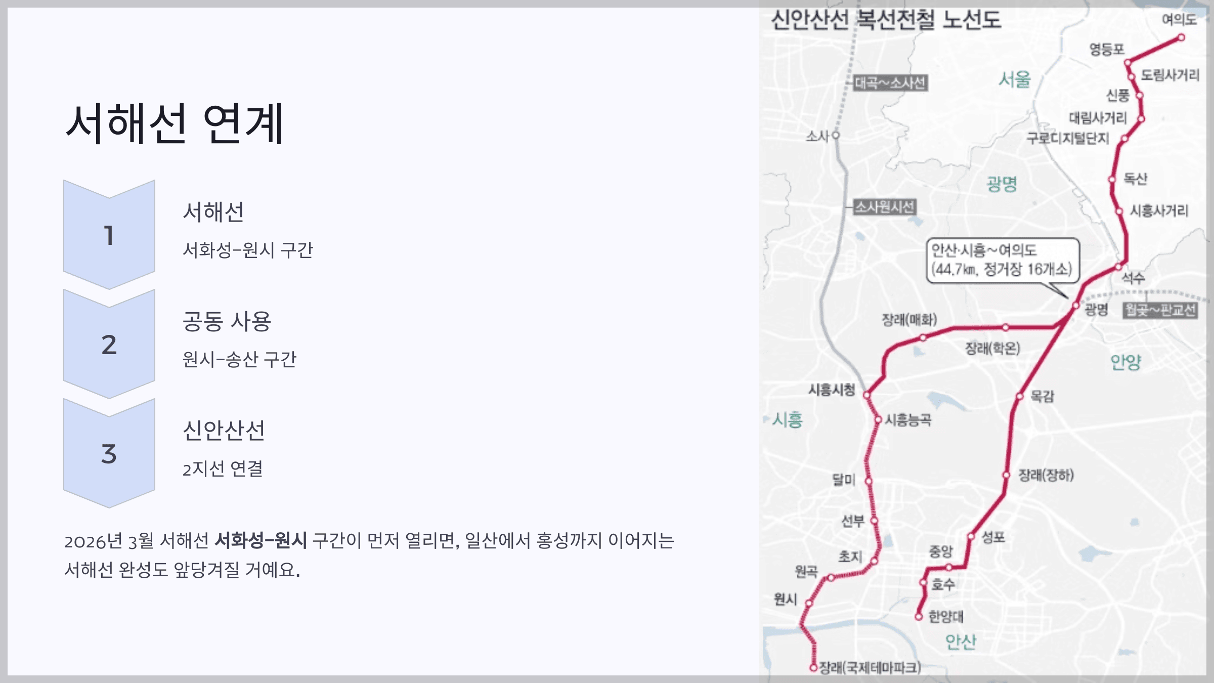 원시‒송산 구간은 신안산선 2 지선과 서해선이 공동 사용해요. 2026년 3월 서해선 서화성‒원시 구간이 먼저 열리면, 일산에서 홍성까지 이어지는 서해선 완성도 앞당겨질 거예요.