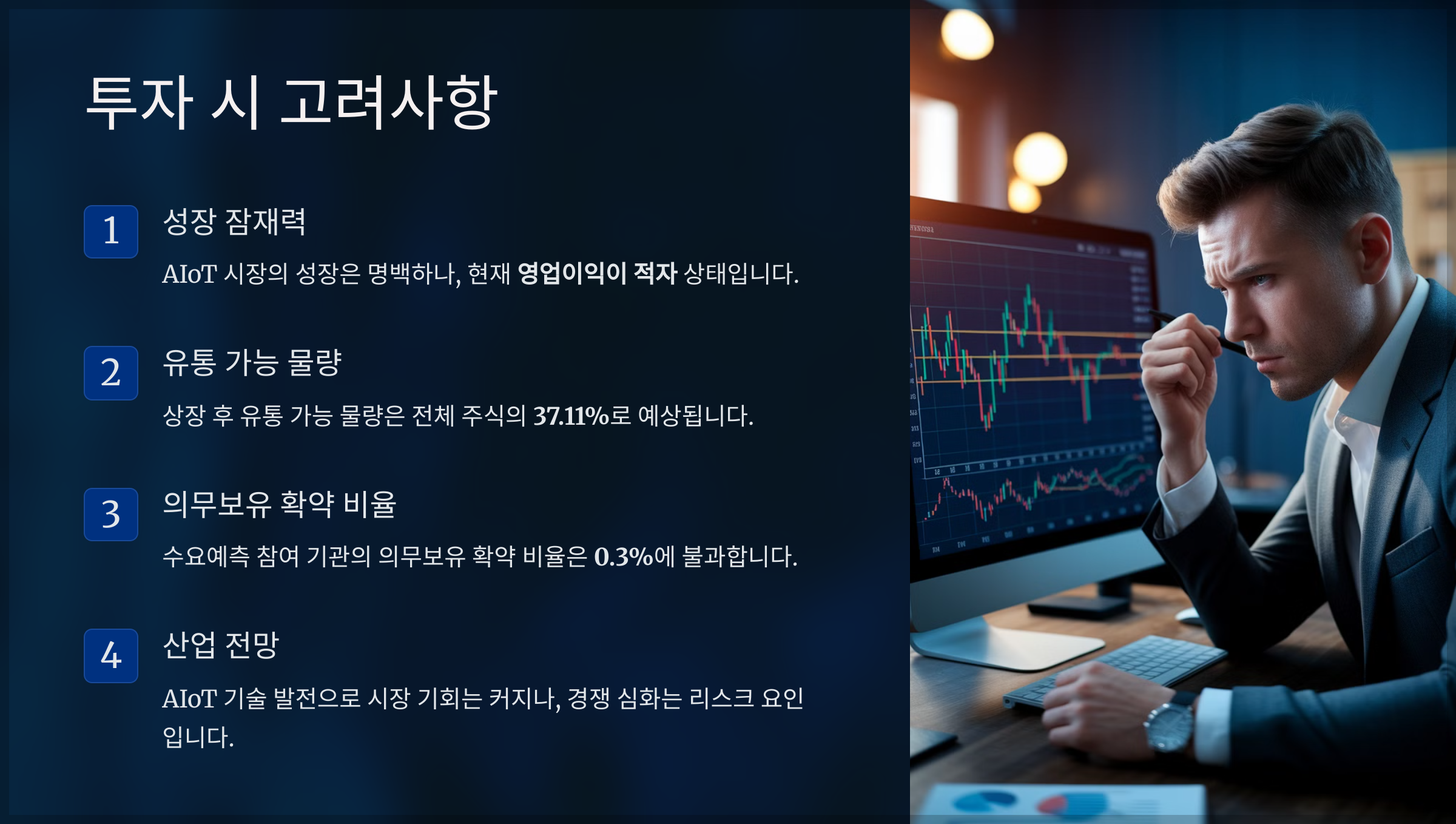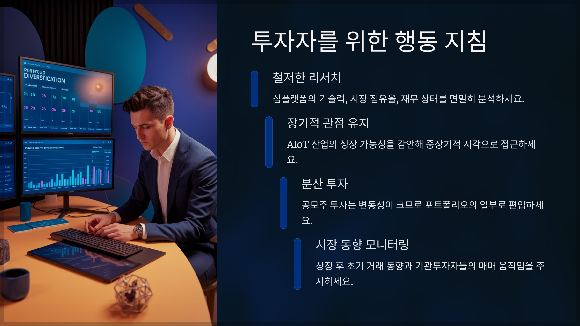 심플랫폼 공모주는 기관투자자들의 높은 관심을 받으며 상장에 대한 기대감이 큰 상황이다. AIoT 산업의 성장 가능성을 고려하면 장기적인 관점에서 투자 매력이 있다. 그러나 현재 영업이익 적자 상태와 낮은 의무보유 확약 비율 등은 주가 변동성을 키울 수 있는 요인이다. 충분한 리서치와 전문가의 조언을 통해 신중하게 접근하는 것이 필요하다.