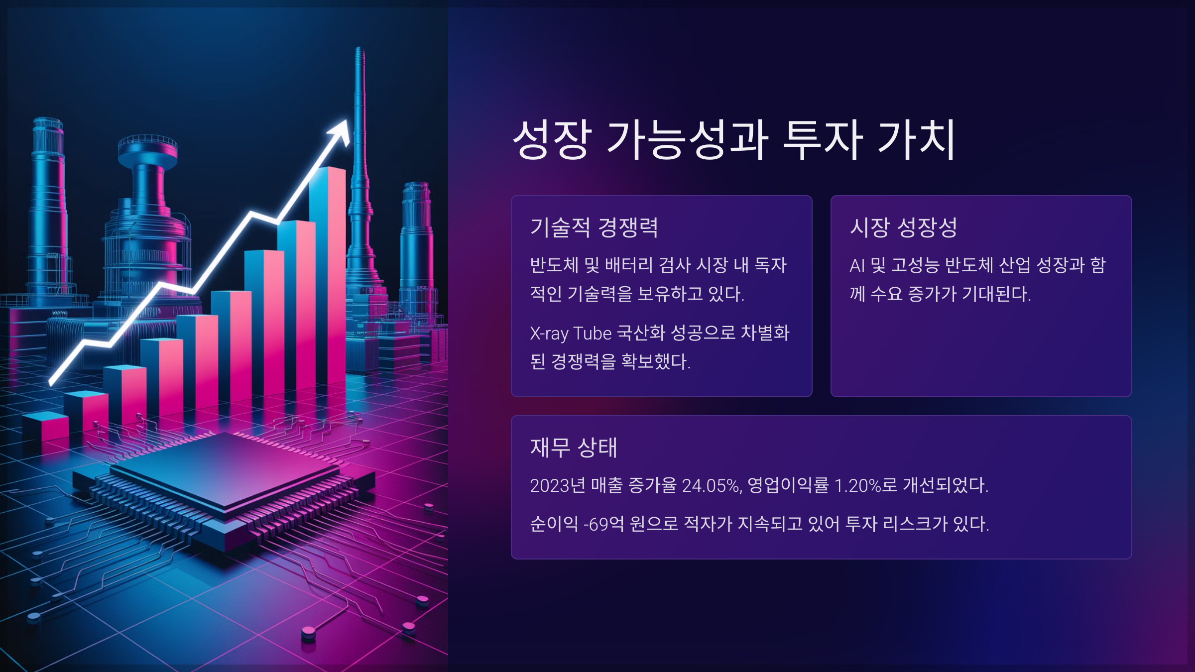 국내에서 X-ray 검사장비를 자체 생산하는 몇 안 되는 기업 중 하나로, 반도체·배터리·방산 산업에서 중요한 역할을 하고 있다.