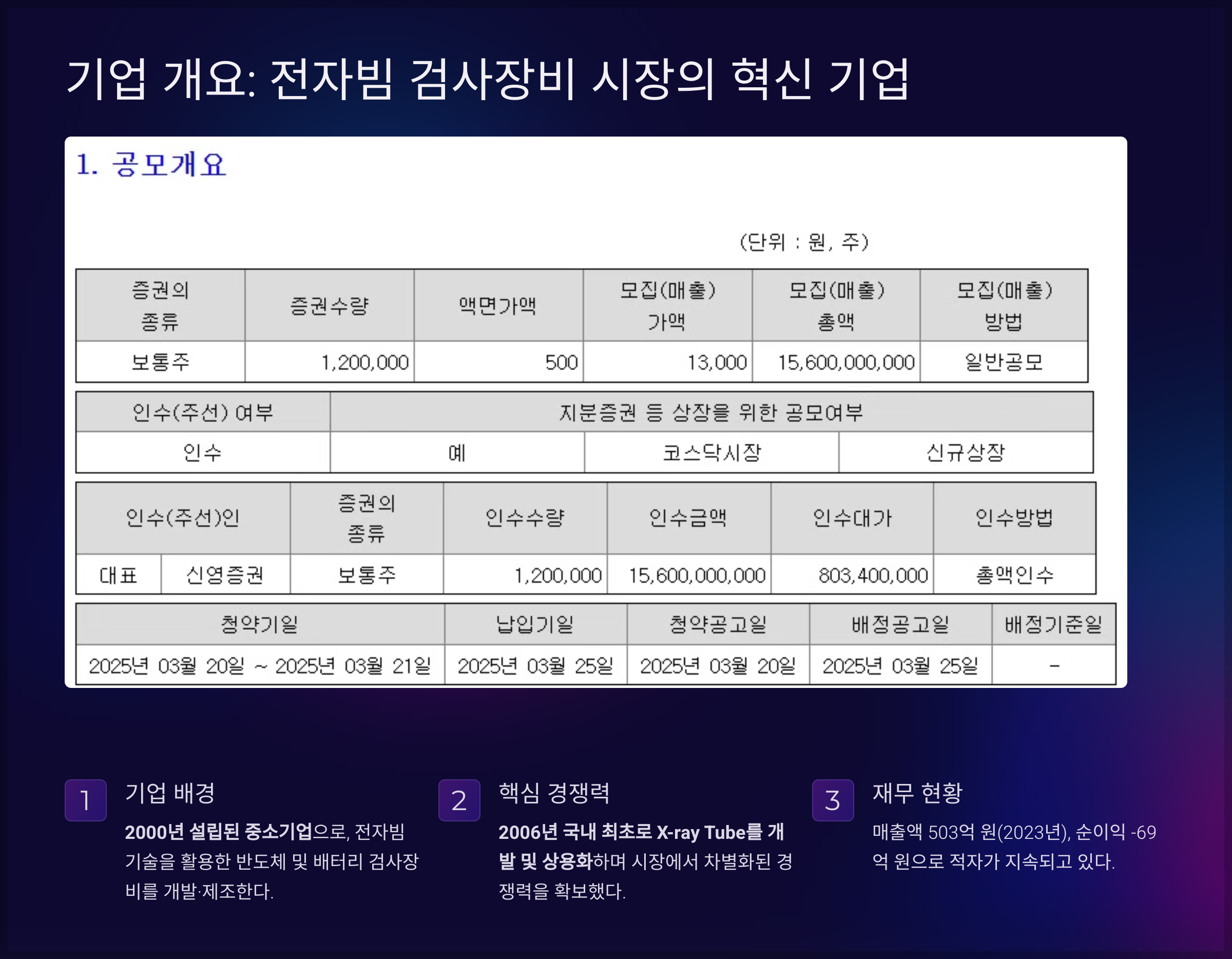 2000년 설립된 중소기업으로, 전자빔 기술을 활용한 반도체 및 배터리 검사장비를 개발·제조하고 있다. 특히 2006년 국내 최초로 X-ray Tube를 개발 및 상용화하면서 시장에서 차별화된 경쟁력을 확보했다.