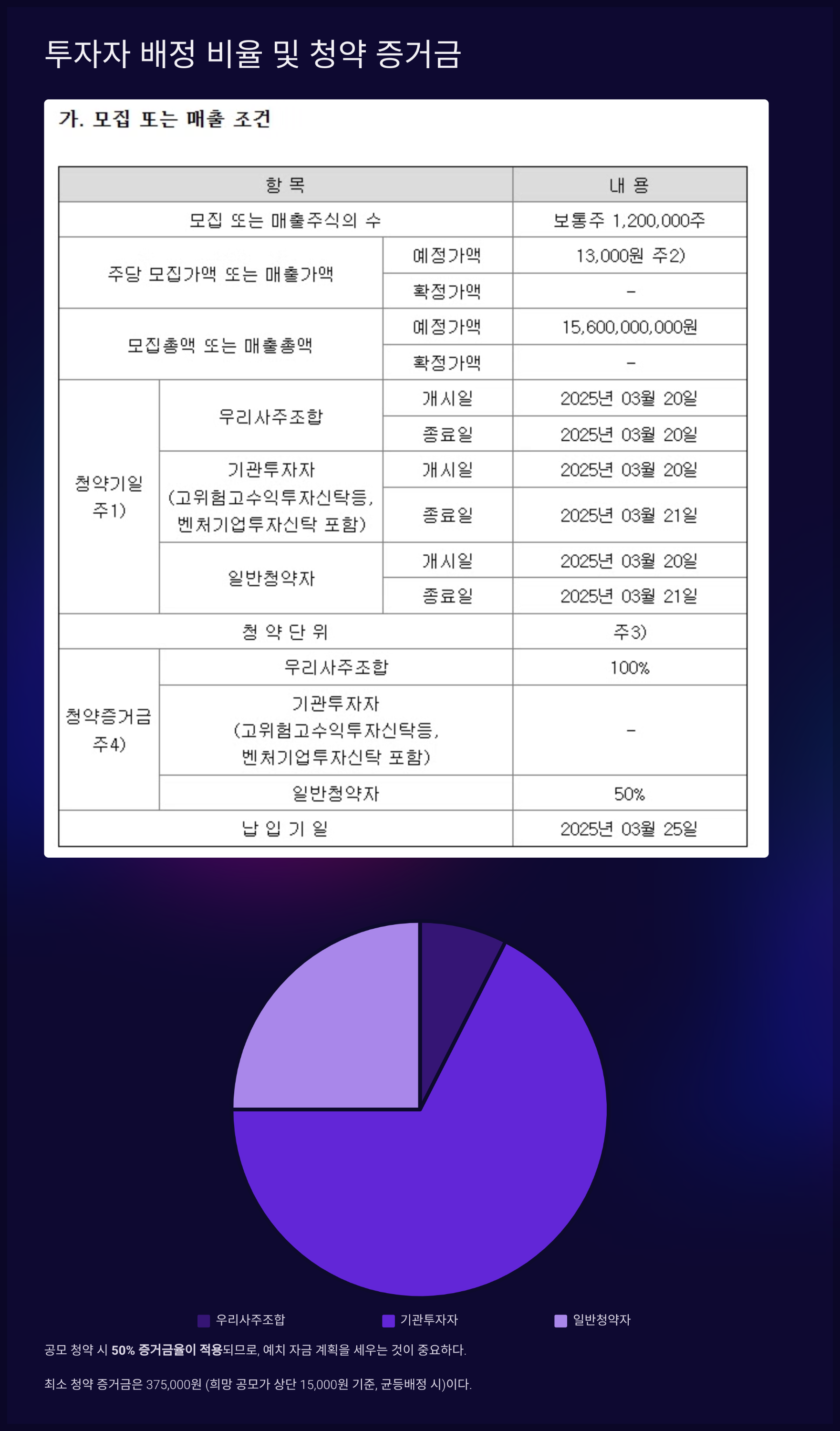 공모 청약 시 50% 증거금률이 적용되므로, 예치 자금 계획을 세우는 것이 중요하다.