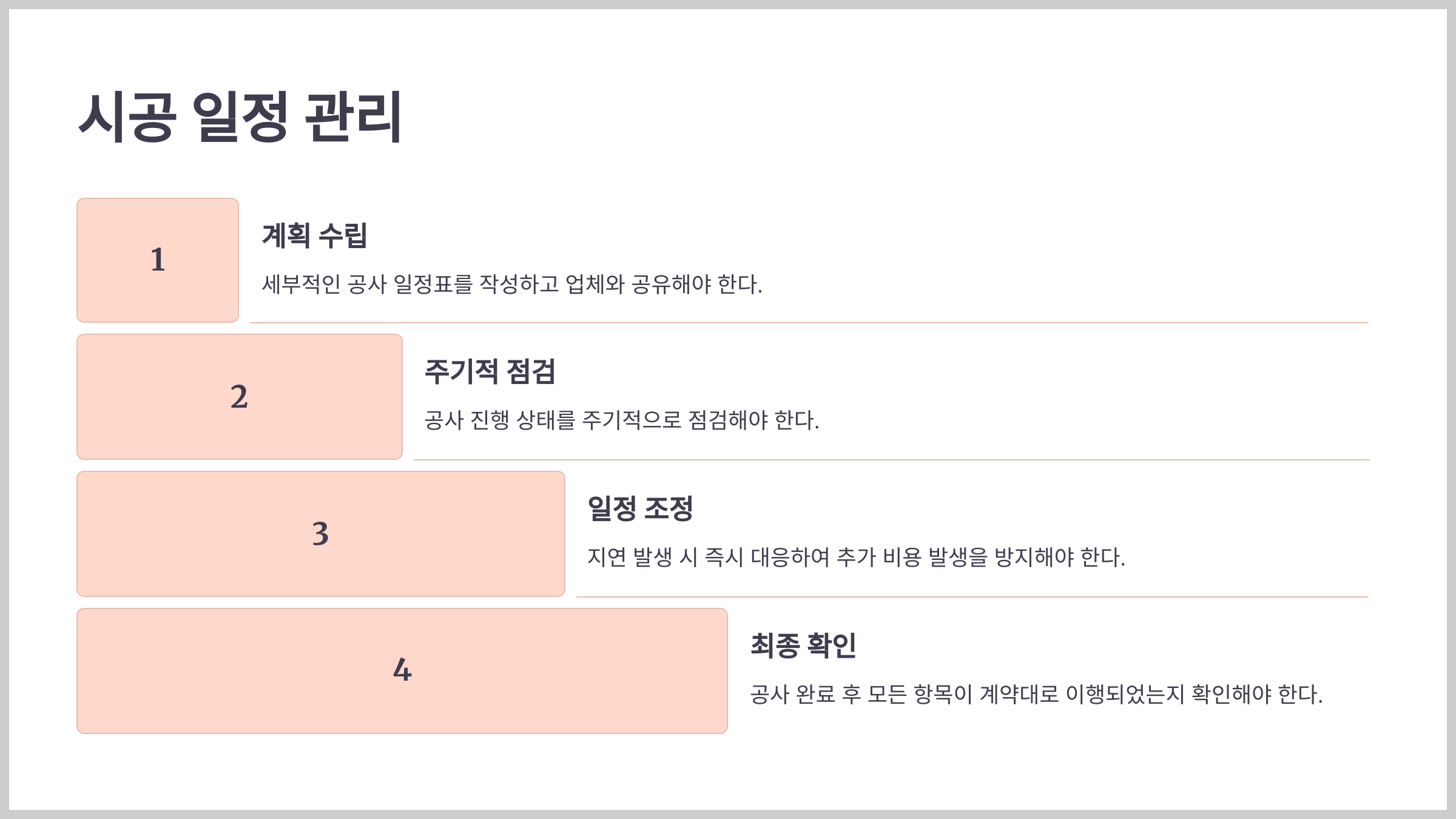 - 공사 일정이 지연되지 않도록 주기적으로 공사 진행 상태를 점검해야 한다.