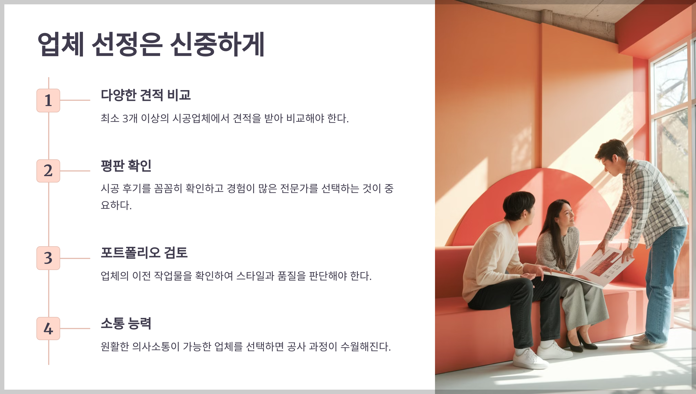 - 최소 3개 이상의 시공업체에서 견적을 받아 비교하고, 평판이 좋은 업체를 선택해야 한다.