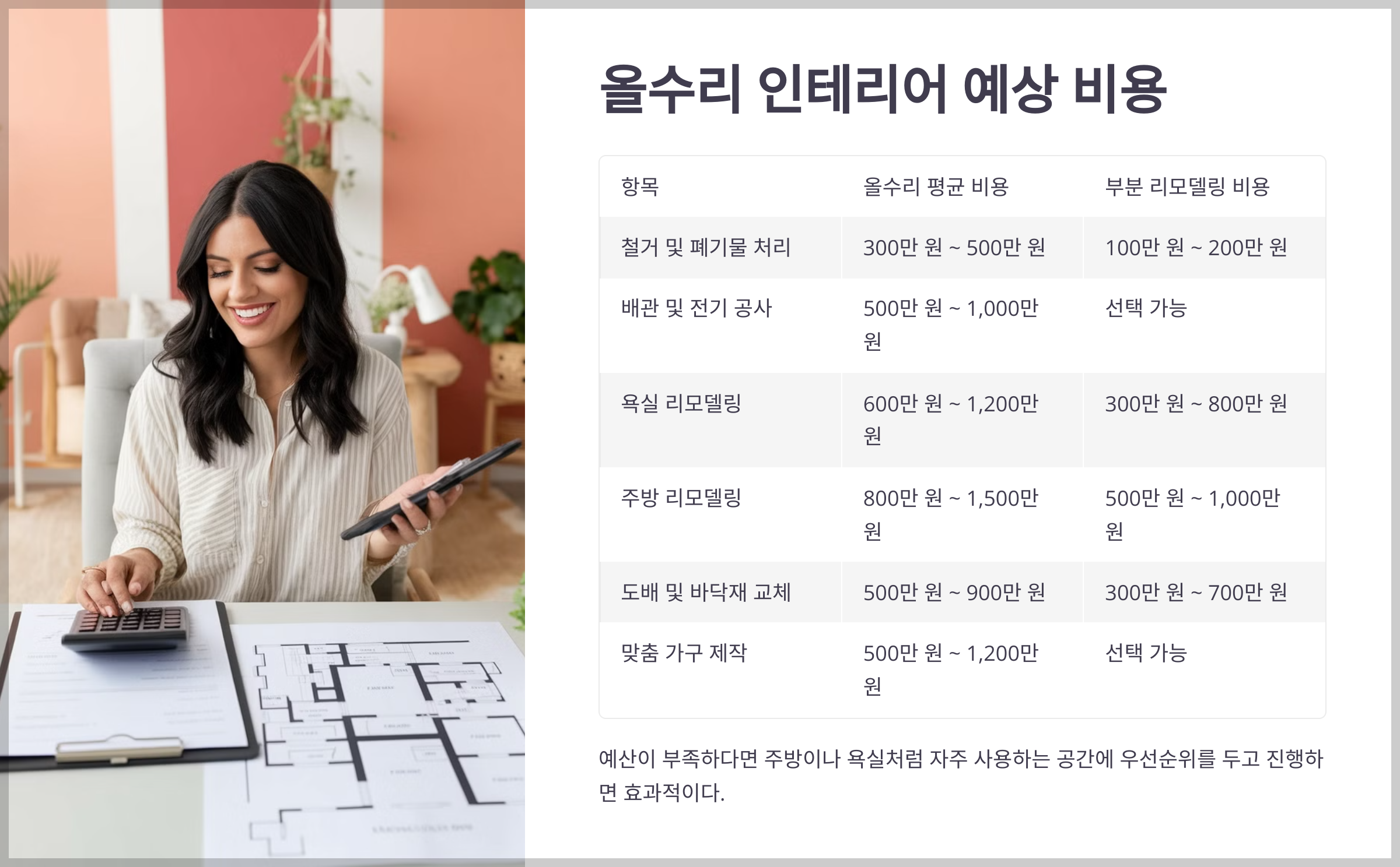 | 항목 | 올수리 평균 비용 | 부분 리모델링 비용 |