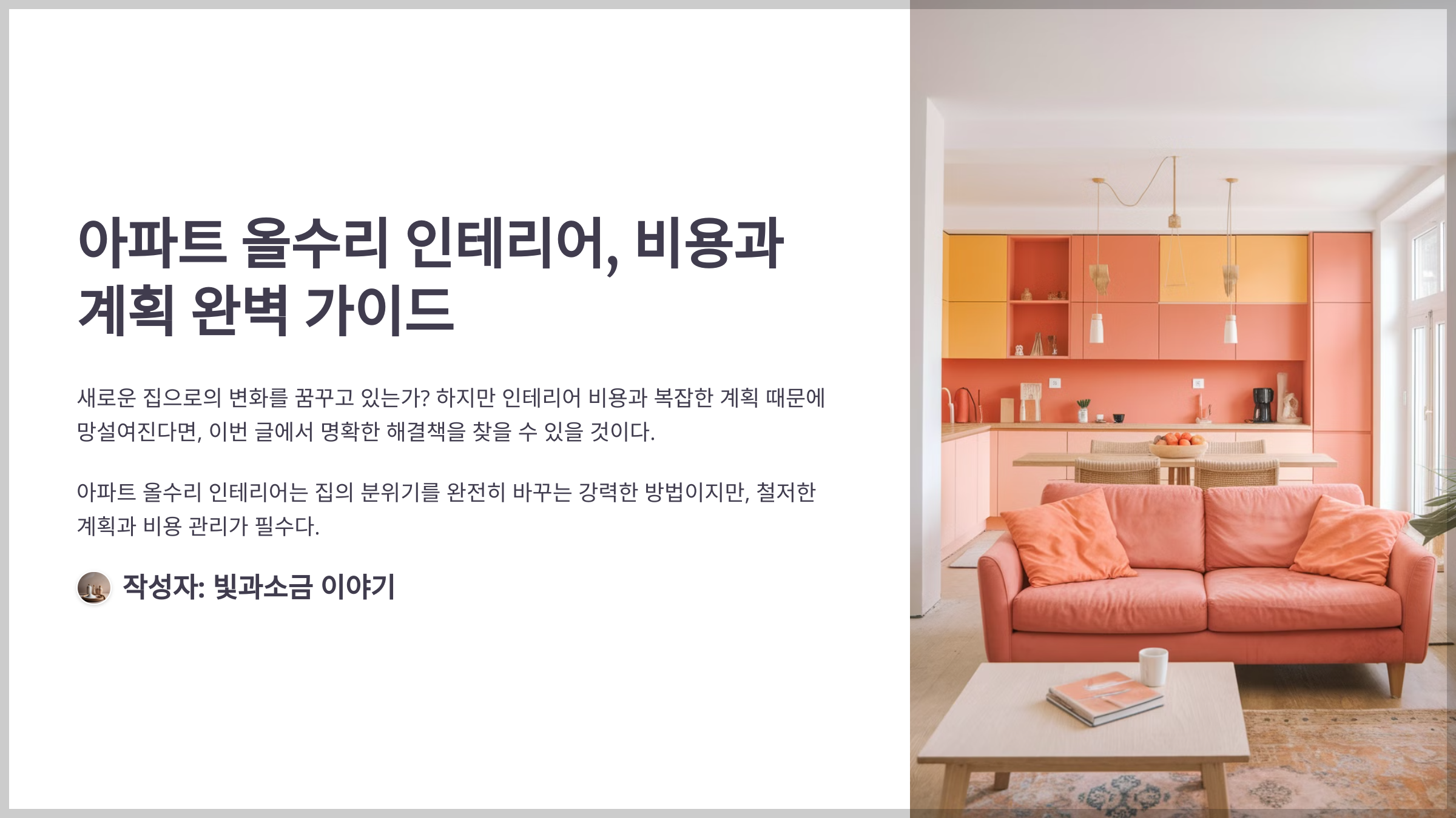 새로운 집으로의 변화를 꿈꾸고 있는가? 하지만 인테리어 비용과 복잡한 계획 때문에 망설여진다면, 이번 글에서 명확한 해결책을 찾을 수 있을 것이다. 아파트 올수리 인테리어는 집의 분위기를 완전히 바꾸는 강력한 방법이지만, 철저한 계획과 비용 관리가 필수다.
