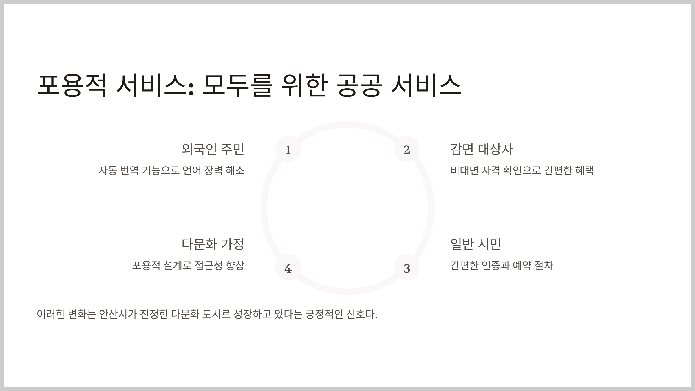 이러한 변화는 안산시가 진정한 다문화 도시로 성장하고 있다는 긍정적인 신호다. 누구나 차별 없이 공공 서비스를 누릴 수 있는 기반이 마련되었다.