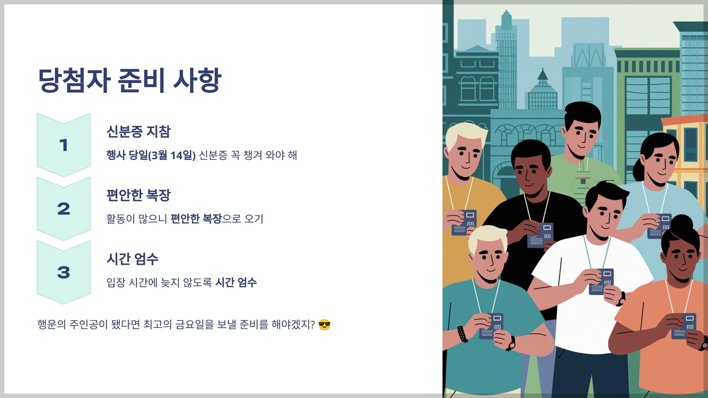 - 행사 당일(3월 14일) 신분증 꼭 챙겨 와야 해