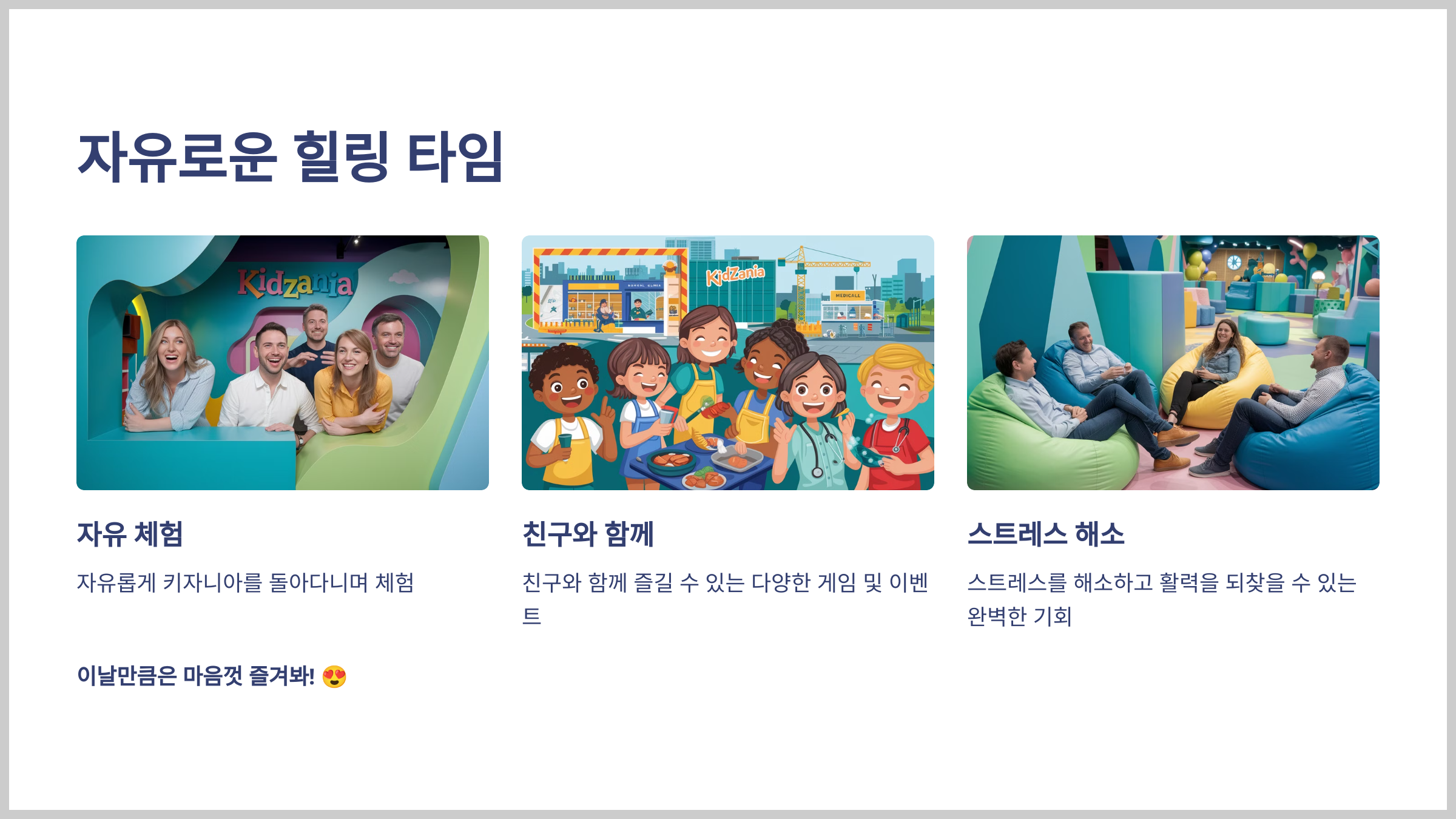 현대 사회에서 어른으로 살아가다 보면 일상에 지쳐 즐거움을 잊기 쉽지. 하지만 키즈아니야 데이는 그 잃어버린 즐거움을 되찾을 기회야. 직장과 책임감에서 잠시 벗어나 마음껏 즐기면서 동심을 되살릴 수 있는 기회를 놓치지 마!