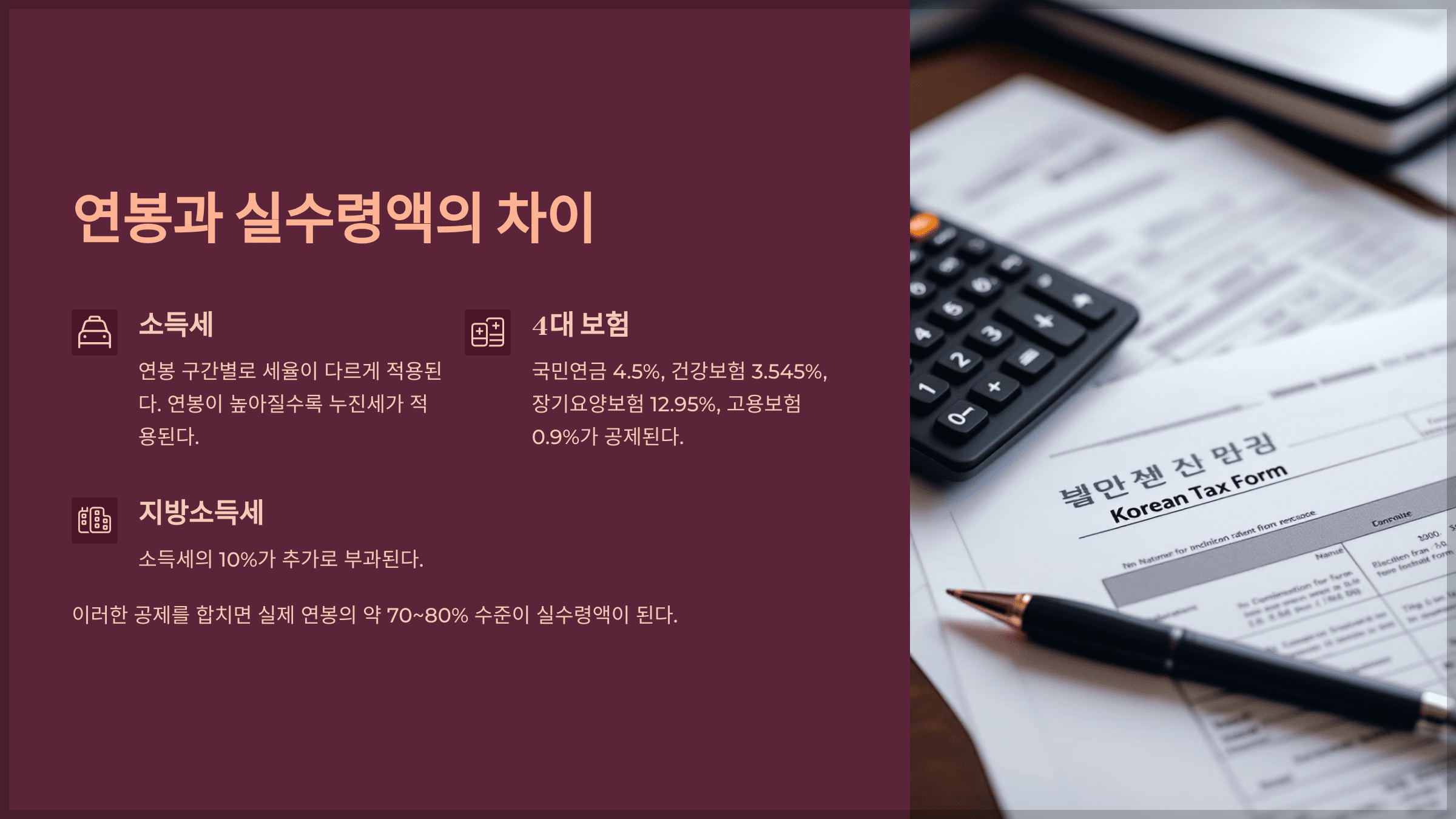 이러한 공제를 합치면 실제 연봉의 약 70~80% 수준이 실수령액이 된다.