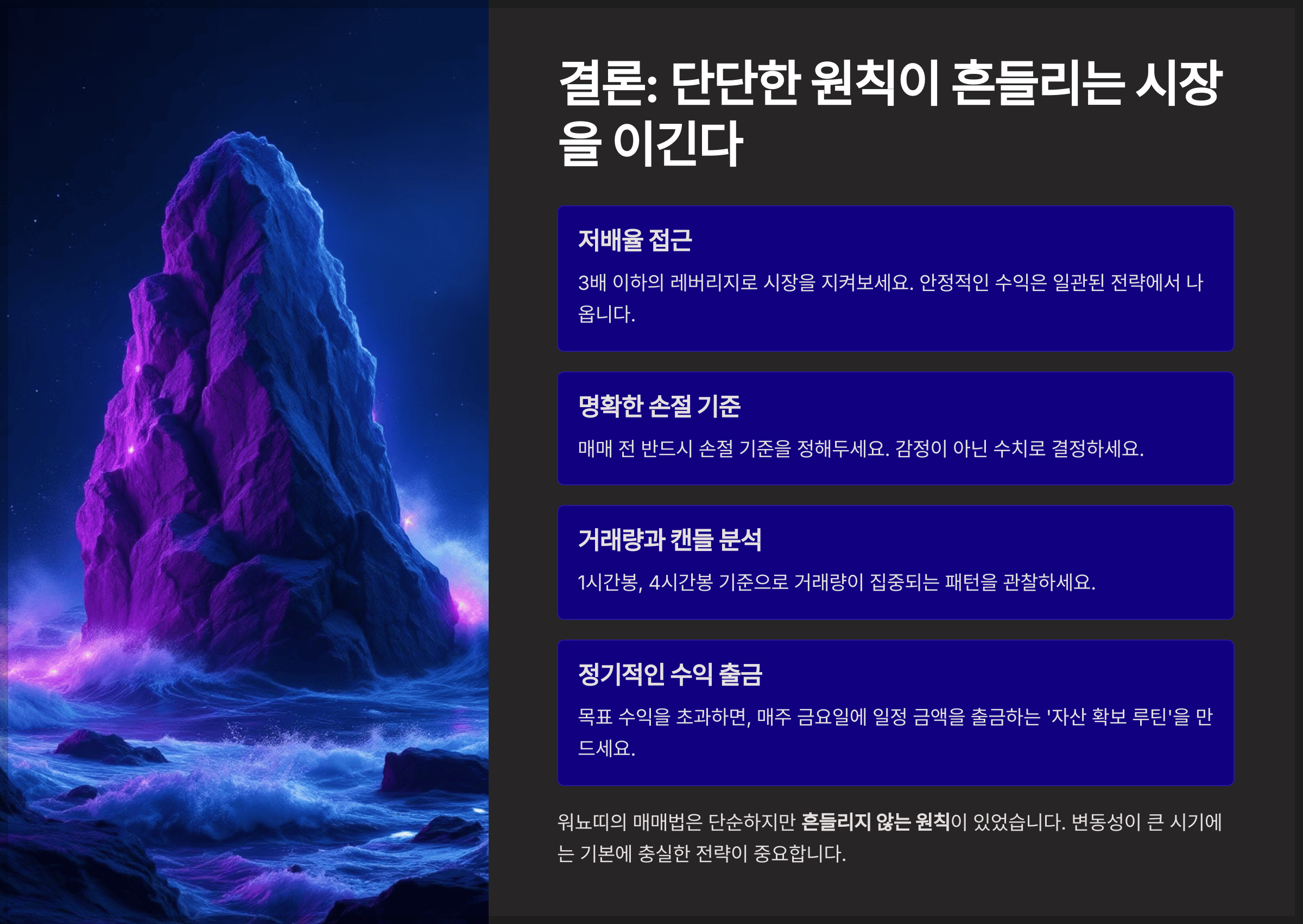워뇨띠의 매매법은 단순합니다. 하지만 그 단순함 속에는 흔들리지 않는 원칙이 있었어요. 지금처럼 변동성이 큰 시기엔 그 어느 때보다 기본에 충실한 전략이 중요하죠.