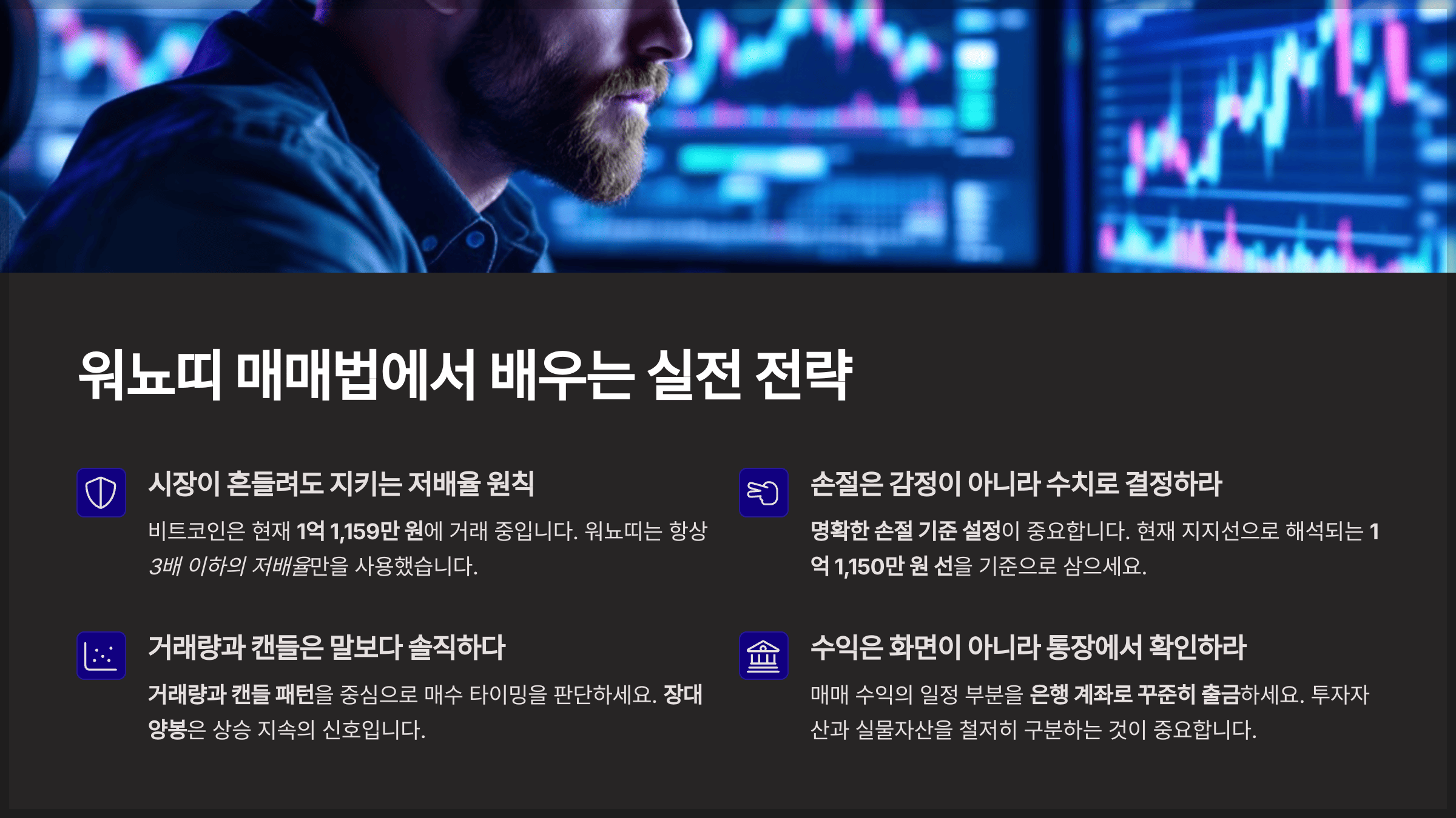 이처럼 중요한 전환점이 될 수 있는 상황에서, 과거 600만 원으로 시작해 3천억 원 이상의 수익을 올린 전설적인 트레이더 워뇨띠의 매매 전략은 시사하는 바가 크죠. 지금부터 워뇨띠가 실전에서 활용한 투자 원칙들을, 현재 시장 상황과 연결해 구체적으로 알아볼게요.