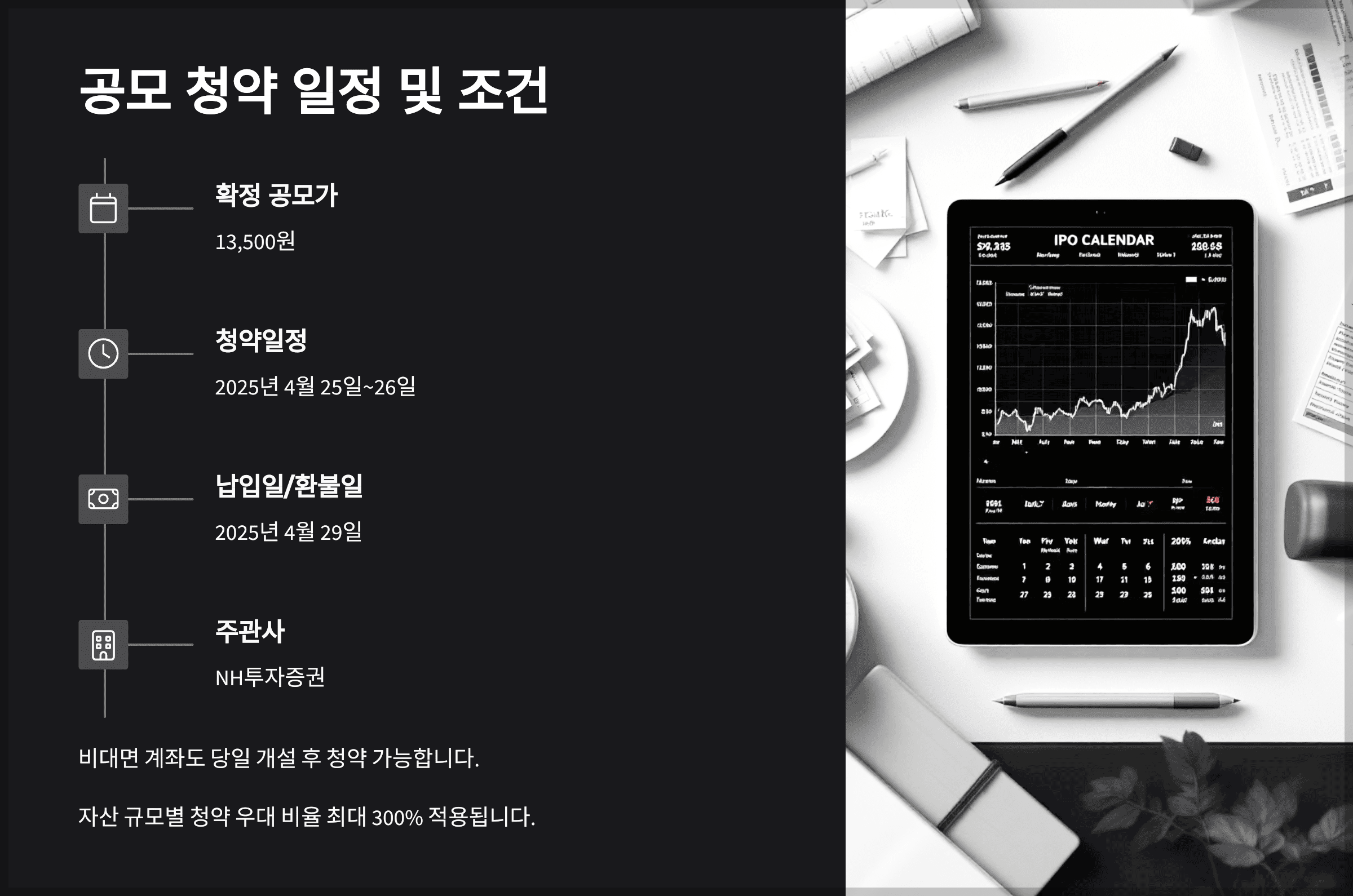 상장을 통해 더 큰 성장을 도모하려는 이 시점은, 성장성과 안정성을 겸비한 공모주를 찾는 분들에게 알맞은 기회가 될 수 있습니다.