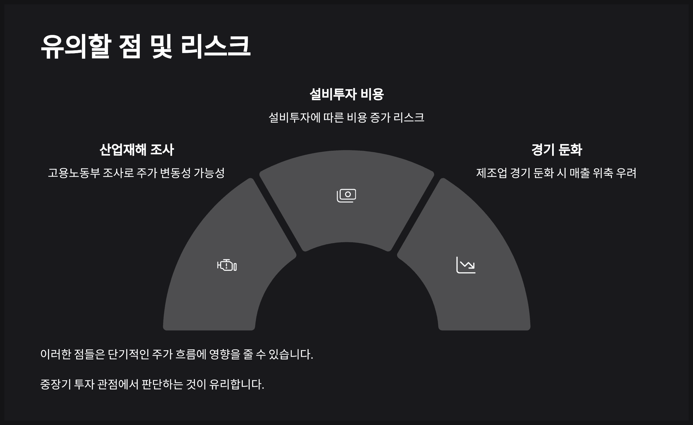 이러한 점들은 단기적인 주가 흐름에 영향을 줄 수 있으므로, 중장기 투자 관점에서 판단하는 것이 유리합니다.