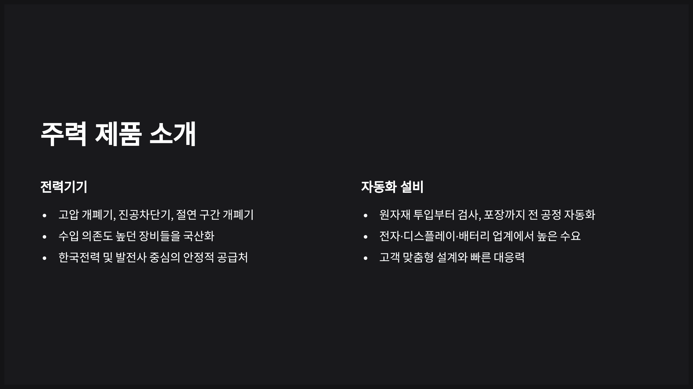 - 사업분야: 전력기기 및 산업 자동화 설비 제조