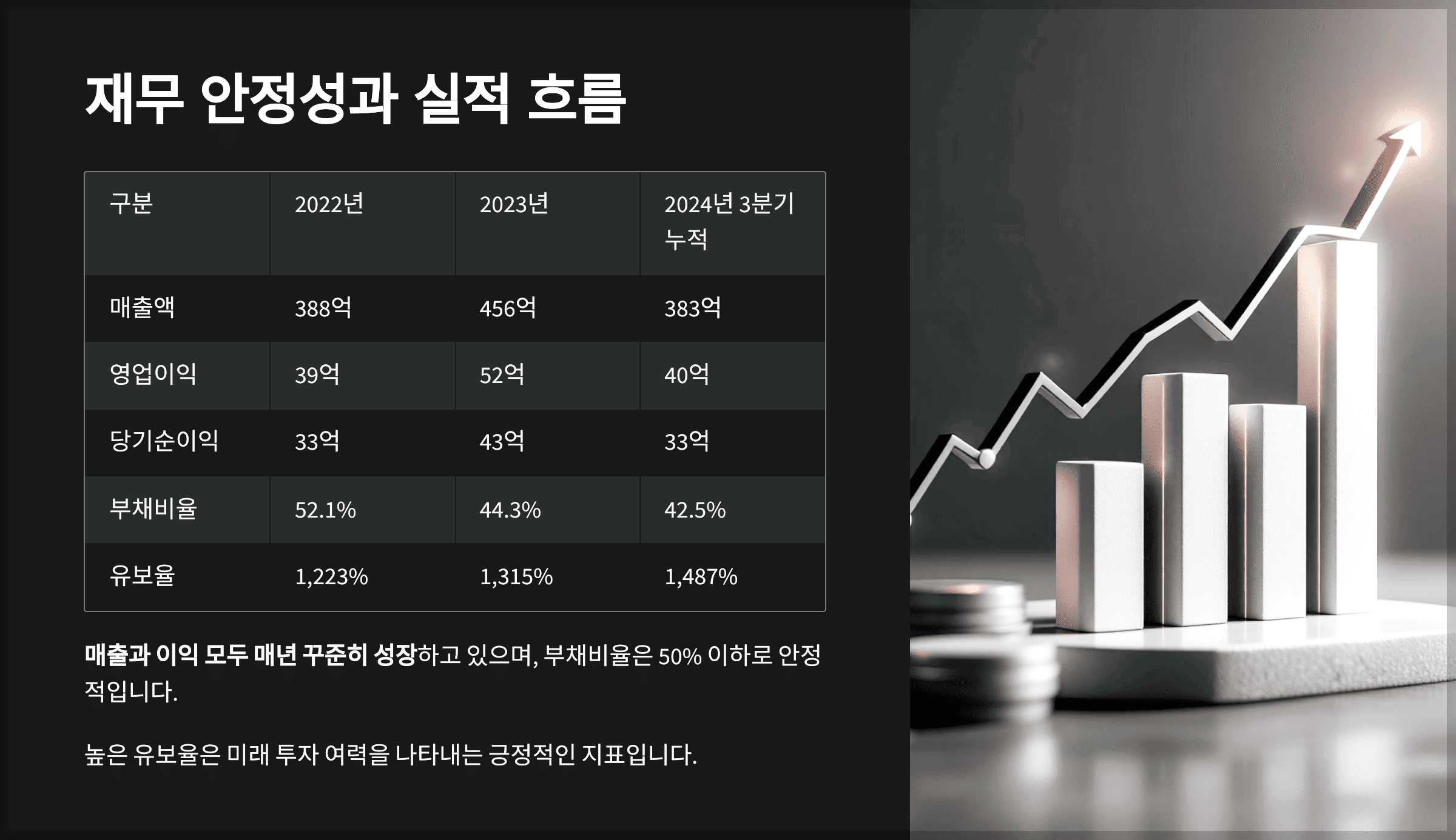 매출과 이익 모두 매년 꾸준히 성장하고 있으며, 부채비율은 50% 이하로 안정적입니다. 또한 높은 유보율은 미래 투자 여력을 나타내는 긍정적인 지표로 볼 수 있어요.