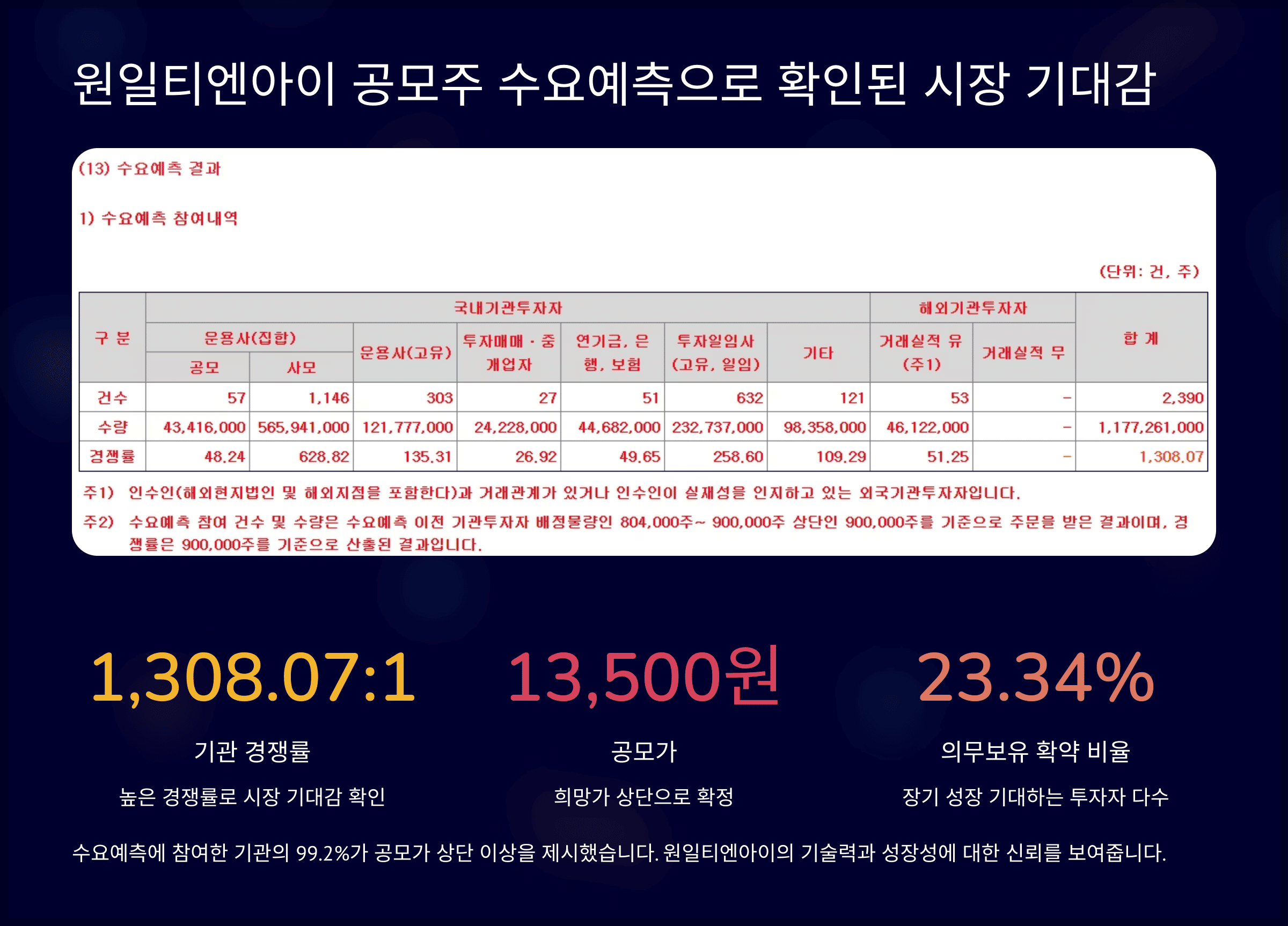 수요예측에 참여한 기관의 99.2%가 공모가 상단 이상을 제시하며 원일티엔아이의 기술력과 성장성에 대한 신뢰를 드러냈어요. 의무보유 확약 비율도 높은 수준으로, 단기 차익보다 장기 성장을 바라보는 투자자가 많다는 점에서 긍정적인 신호로 해석됩니다.