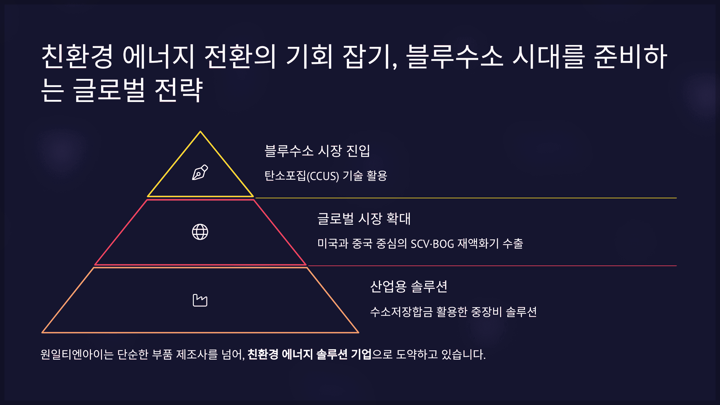원일티엔아이는 단순한 부품 제조사를 넘어, 친환경 에너지 설루션 기업으로 도약하고 있어요. 수소저장합금을 활용한 산업용 장비 설루션, 미국과 중국 중심의 SCV·BOG 재액화기 수출, 그리고 탄소포집(CCUS) 기술을 통한 블루수소 시장 진입까지, 다각적인 전략을 통해 글로벌 경쟁력을 강화해 나가고 있습니다.