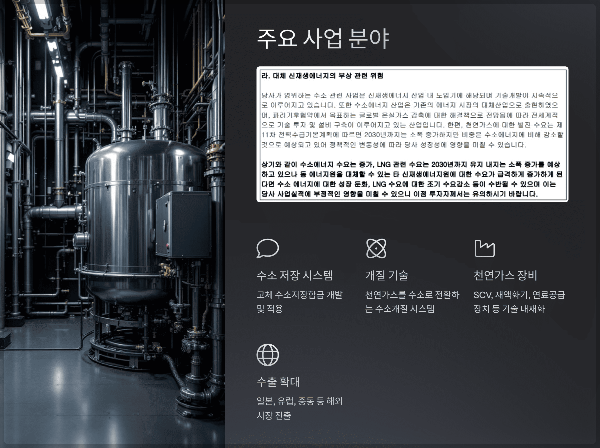 국내에서 수소저장합금을 자체 기술로 양산화한 기업은 드물다. SCV(고압연소식 기화장치) 등 다양한 장비를 독자 개발해 수소 에너지뿐 아니라 전통 에너지 산업에서도 입지를 넓히고 있다.