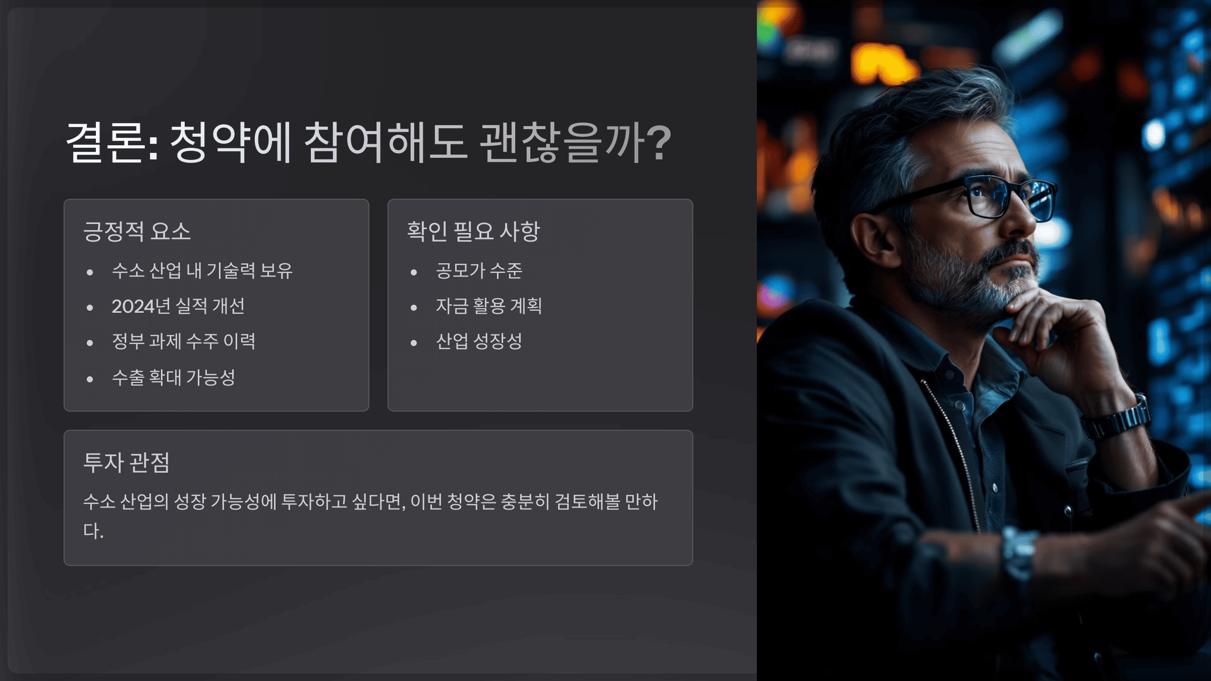 다만, 공모가 수준과 자금 활용 계획을 꼭 점검한 뒤 참여 여부를 결정하는 것이 안전하다. 수소 산업의 성장 가능성에 투자하고 싶다면, 이번 청약은 충분히 검토해 볼 만하다.