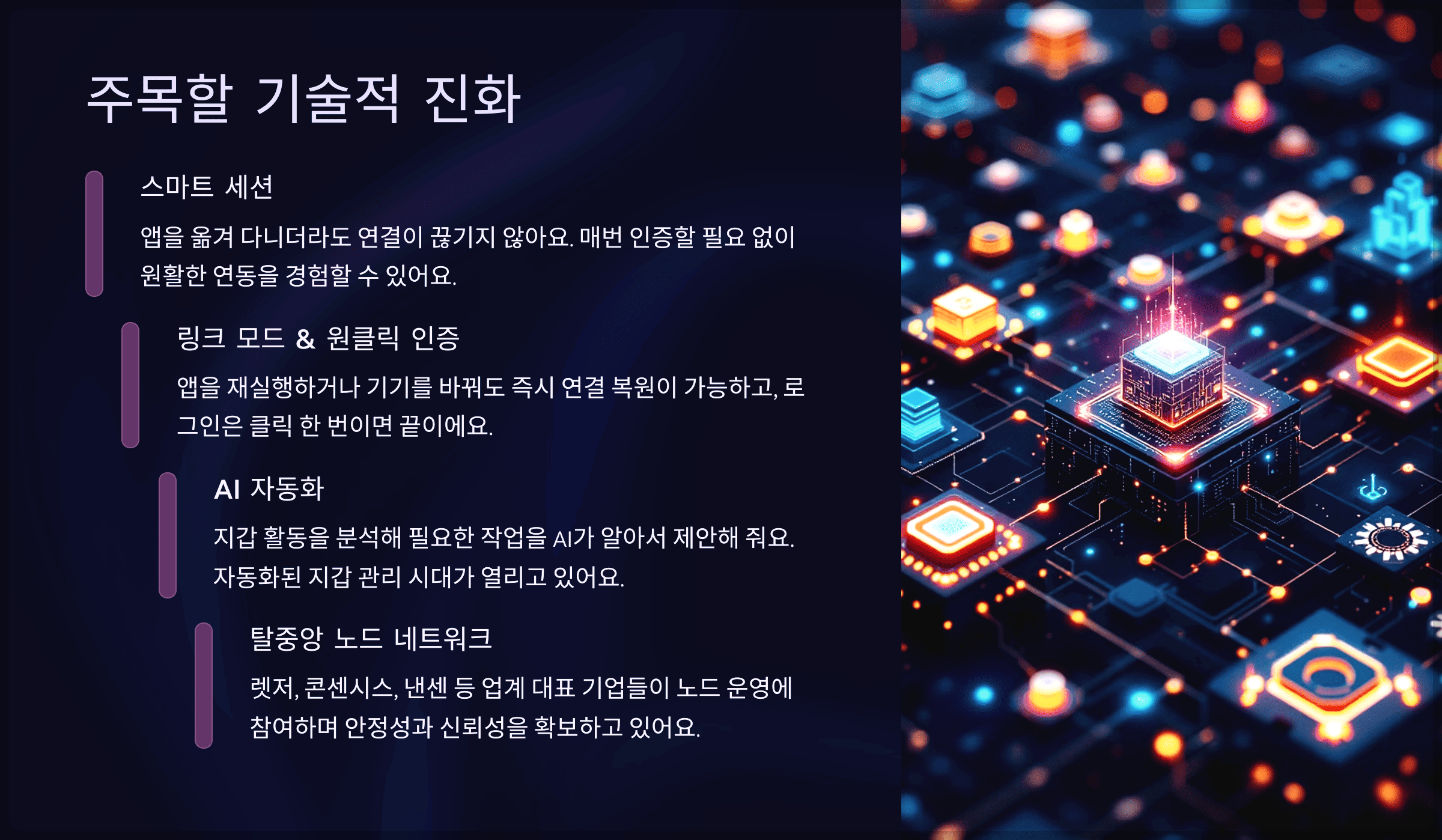- 완전한 탈중앙화 구조: 신뢰성 높은 노드 운영자들이 네트워크를 지탱