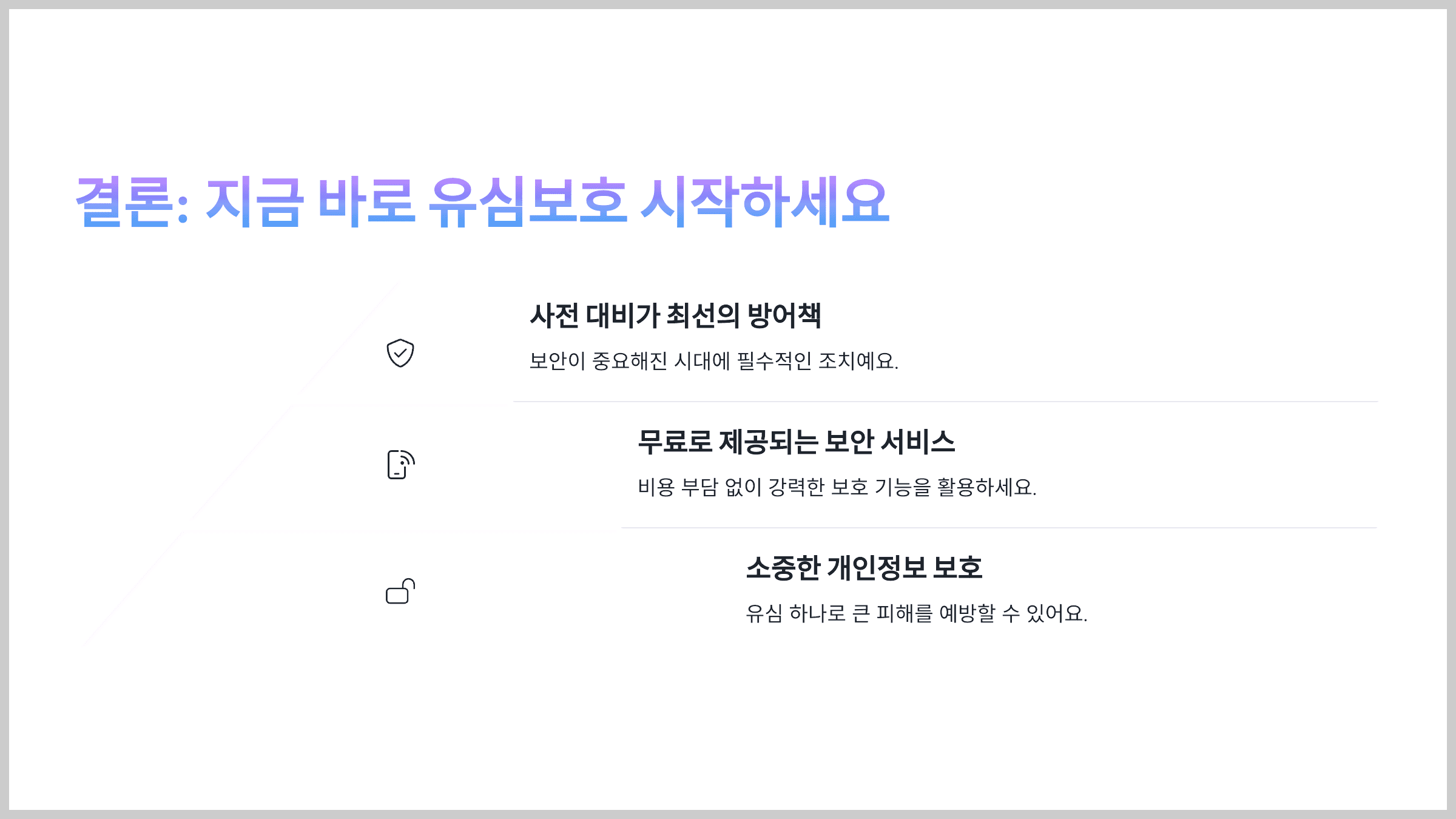 이 세 가지만 지켜도 대부분의 도용 피해는 충분히 예방할 수 있어요.