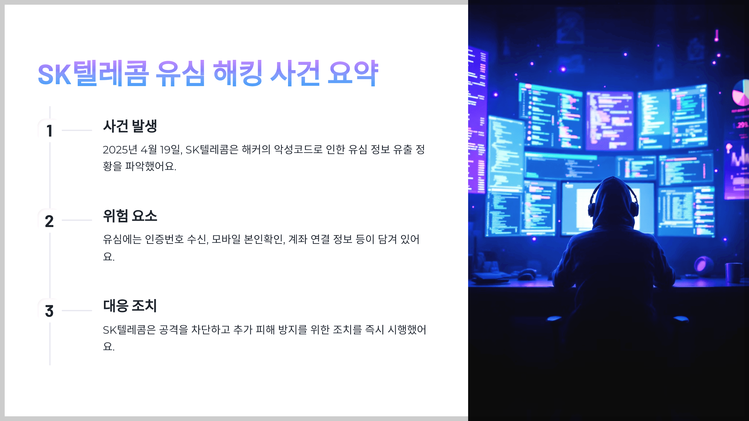 2025년 4월 19일, SK텔레콤은 해커의 악성코드로 인해 일부 고객의 유심 정보가 외부로 유출된 정황을 파악했어요. 유출된 정보는 아직까지 실제로 악용된 사례는 없지만, 유심에는 인증번호 수신, 모바일 본인확인, 계좌 연결 정보 등이 담겨 있어 피해 가능성이 큽니다.
