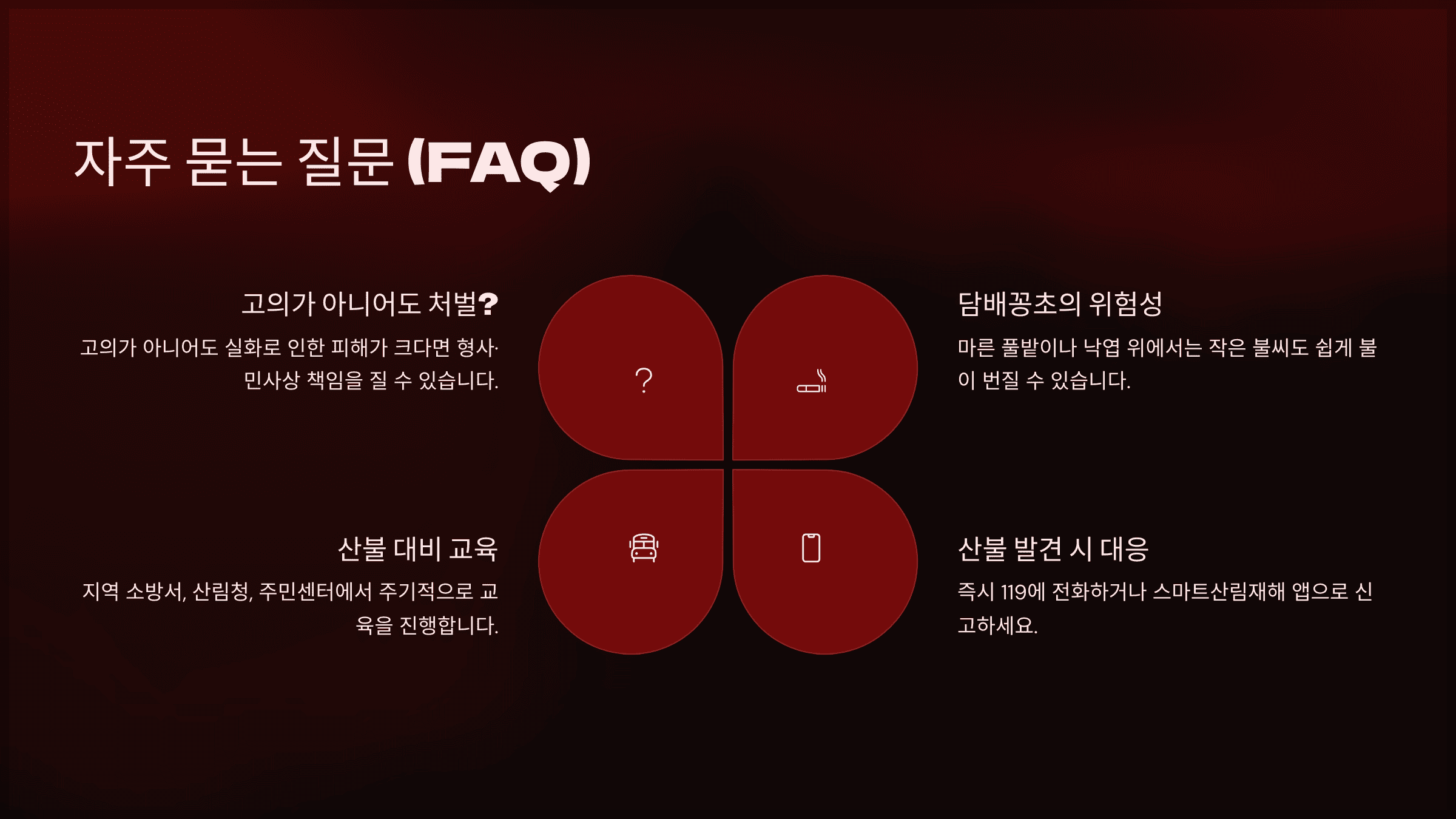 이번 의성 산불을 통해 느낀 점은, '내가 불을 낼 리 없어'라는 생각이 가장 위험하다는 거야. 예방은 결국 행동에서 시작돼. 불 사용 후 철저한 점검, 주변 환경 정비, 비상 상황에 대비한 준비까지, 하나하나 실천하는 것이 중요해.