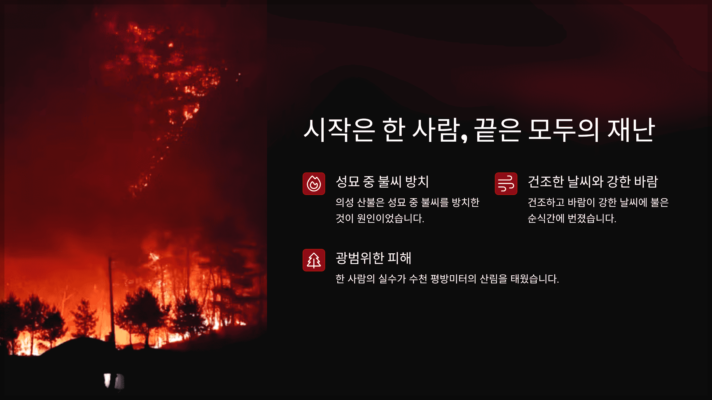 특히 성묘객이 불씨를 제대로 처리하지 않아 시작된 이번 화재는, 봄철 건조한 날씨와 맞물려 순식간에 대형 산불로 번졌지.