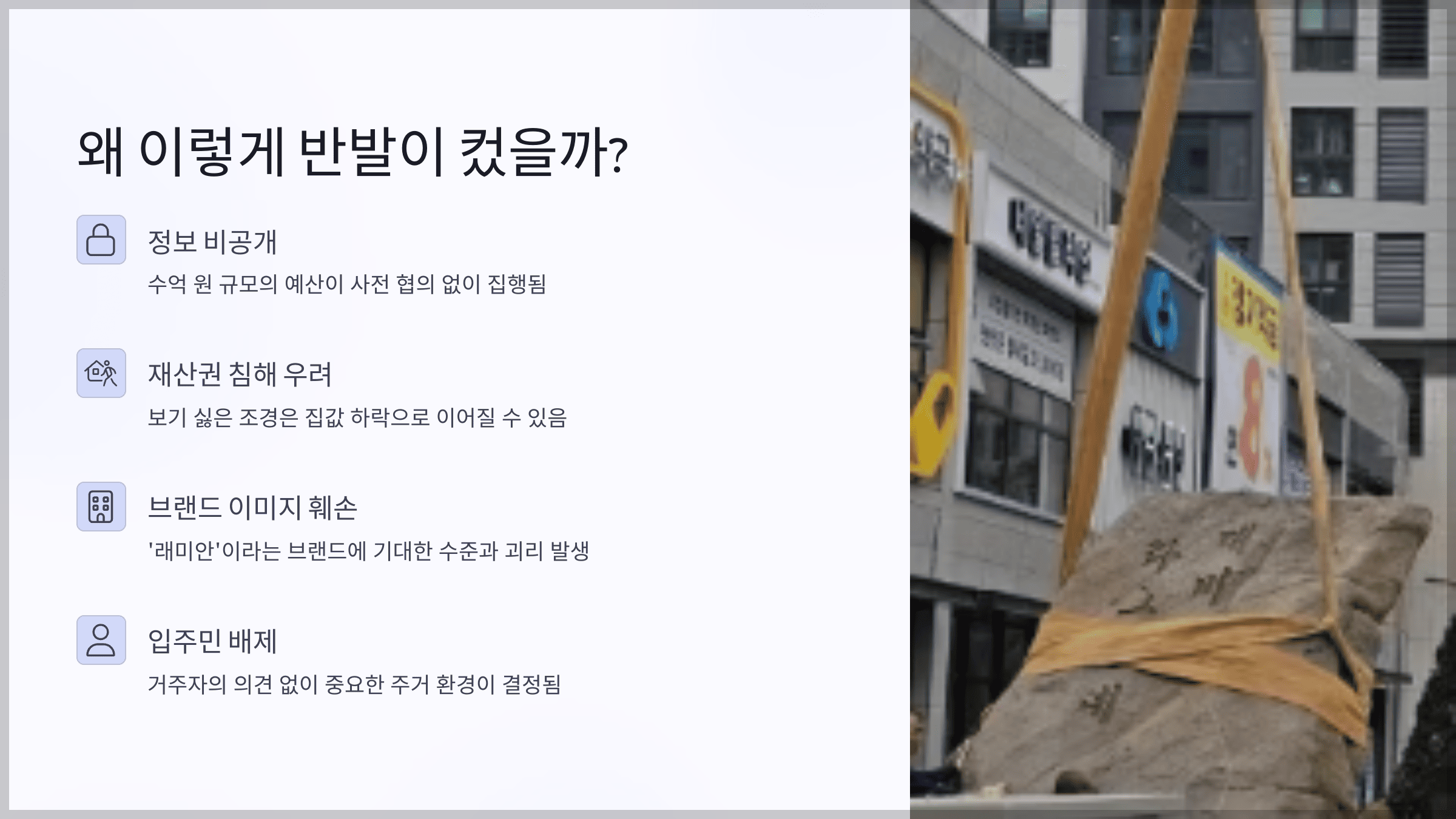 - 입주민 배제: 거주자의 의견 없이 중요한 주거 환경이 결정됨