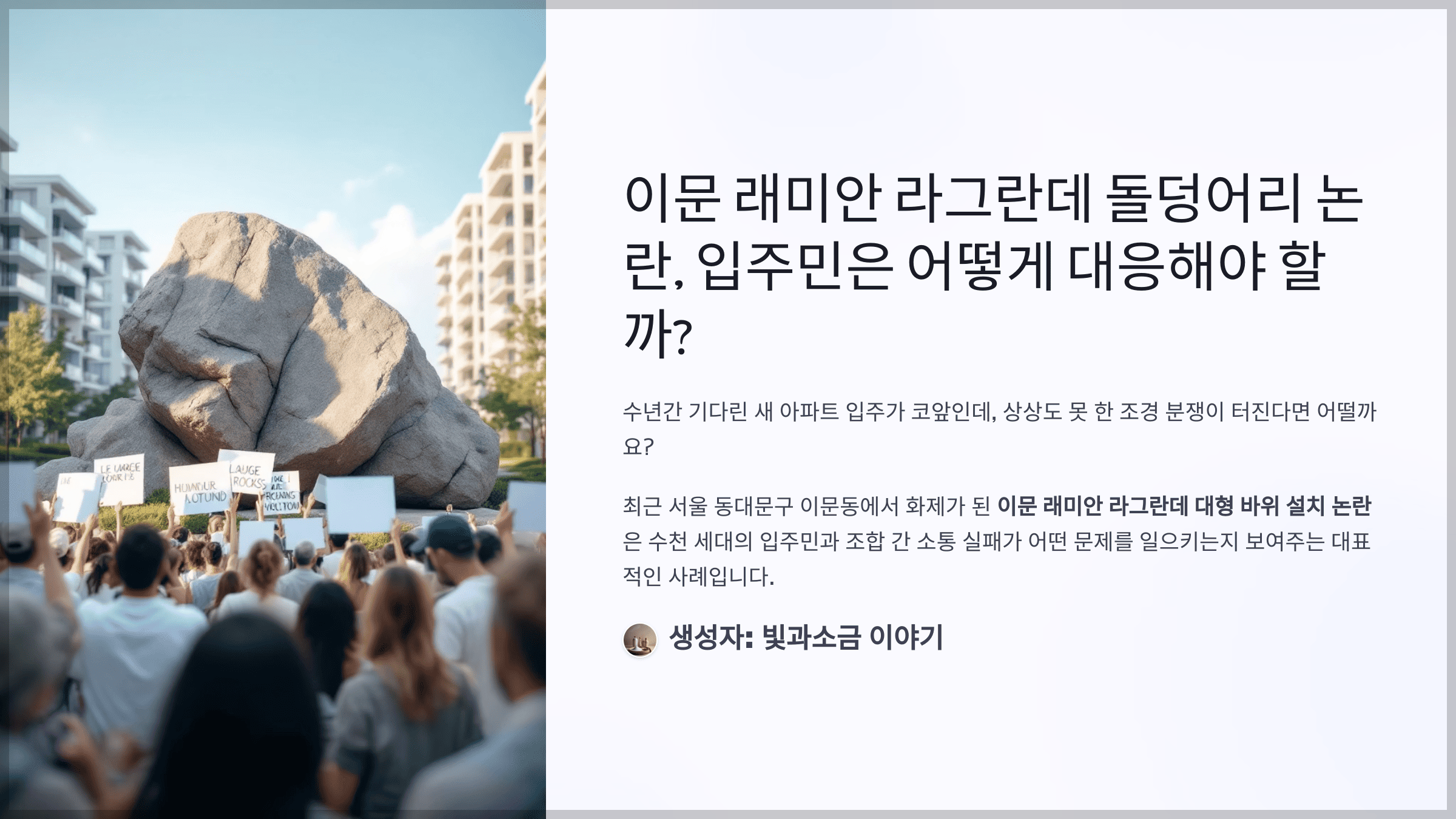 최근 서울 동대문구 이문동에서 화제가 된 ‘이문 래미안 라그란데 대형 바위 설치 논란’은 수천 세대의 입주민과 조합 간 소통 실패가 어떤 문제를 일으키는지 보여주는 대표적인 사례입니다.