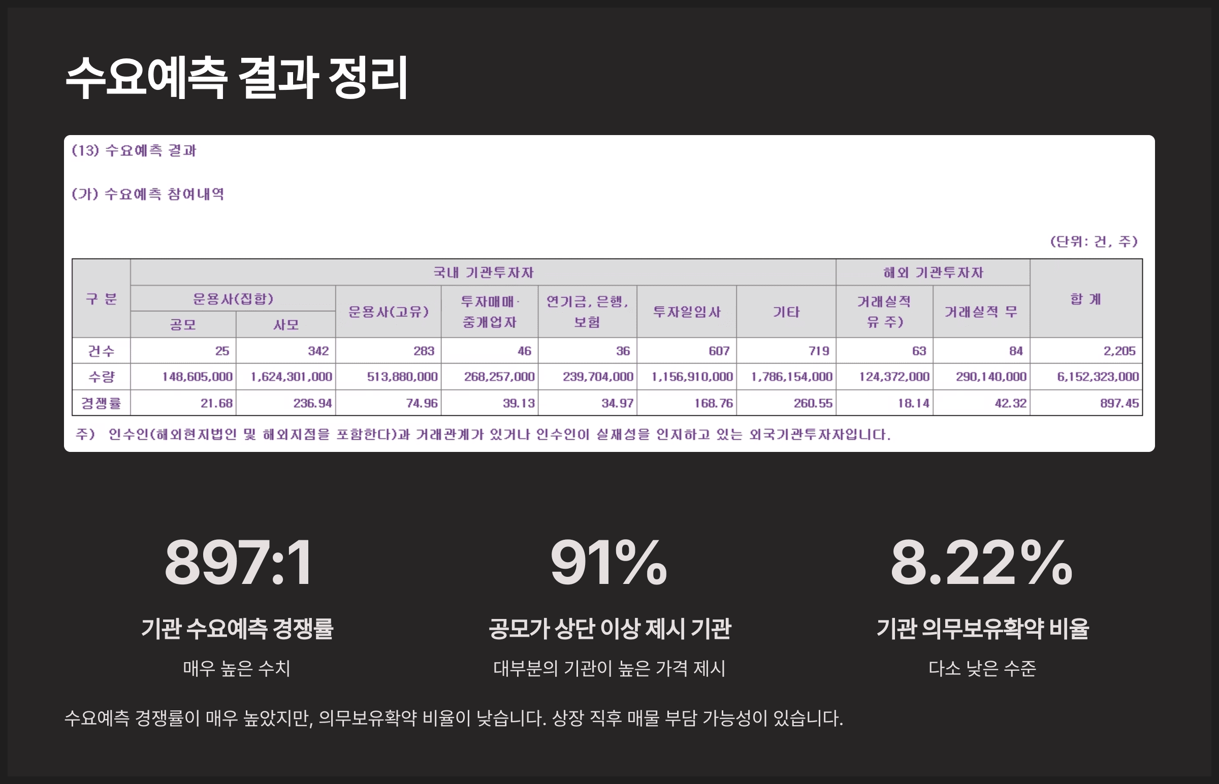 수요예측 경쟁률이 매우 높았지만, 의무보유확약 비율이 낮아 상장 직후 매물 부담 가능성이 있다는 점을 유념해야 합니다.