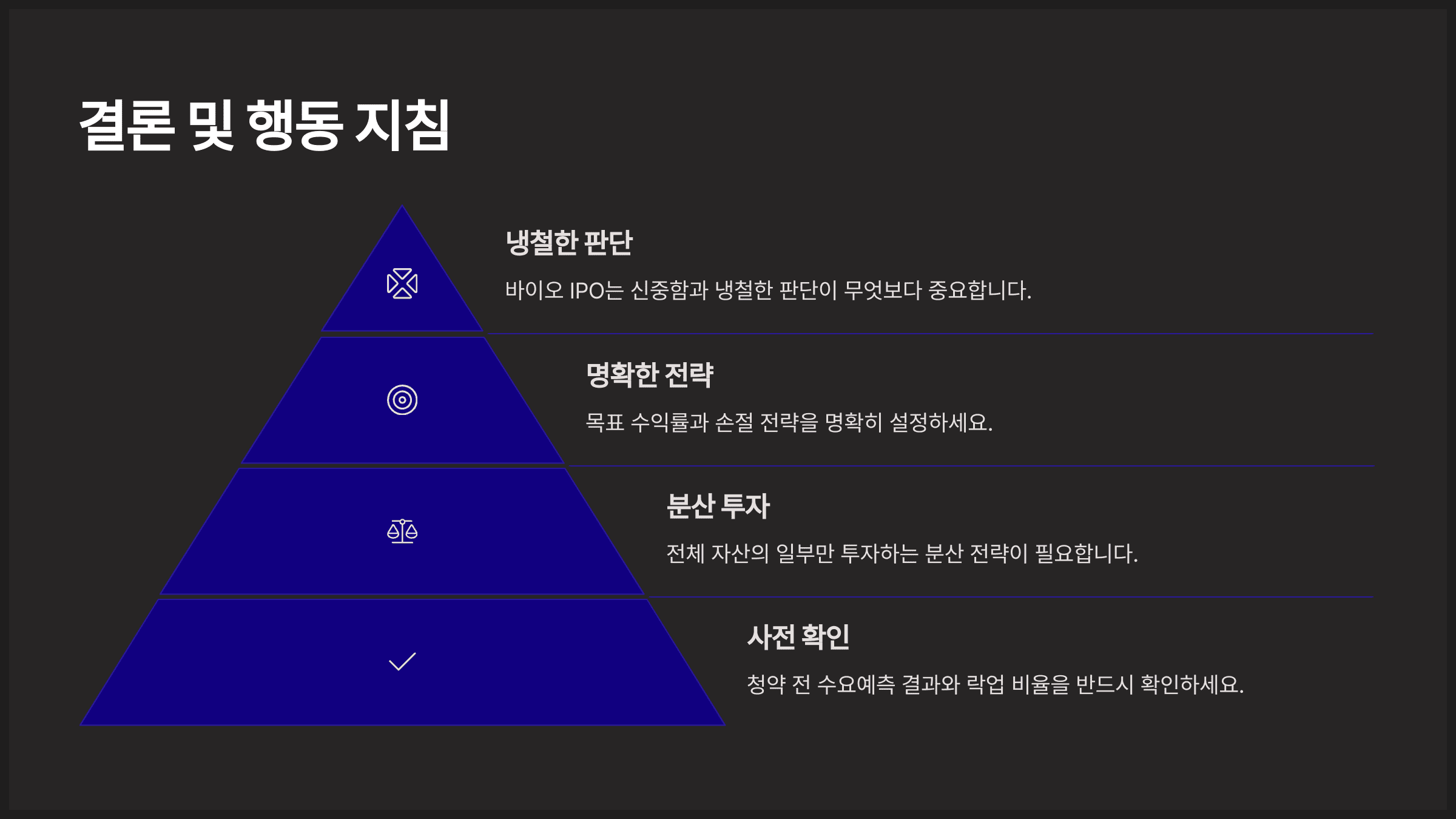 이뮨온시아 공모주는 고위험-고수익 구조를 가진 바이오 투자입니다. 청약에 참여할 경우, 사전에 목표 수익률과 손절 전략을 명확히 설정하고, 전체 자산의 일부만 투자하는 분산 전략이 필요합니다. 청약 전 수요예측 결과와 락업 비율을 반드시 확인하고, 상장일에는 냉정하게 계획대로 움직여야 합니다. 바이오 IPO는 신중함과 냉철한 판단이 무엇보다 중요합니다.