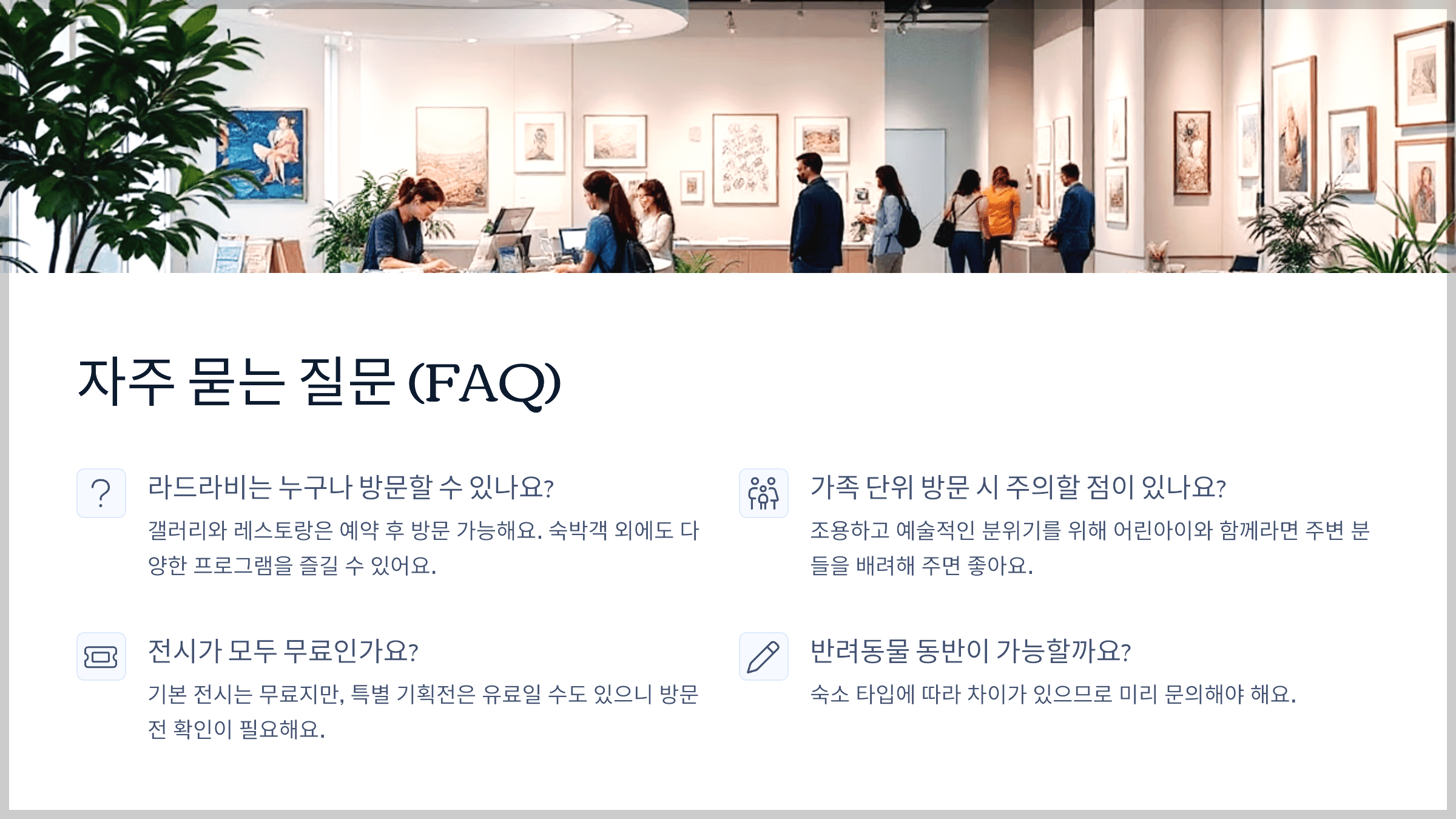 A: 갤러리와 레스토랑은 예약 후 방문 가능해요. 숙박객 외에도 충분히 다양한 프로그램을 즐길 수 있어요.