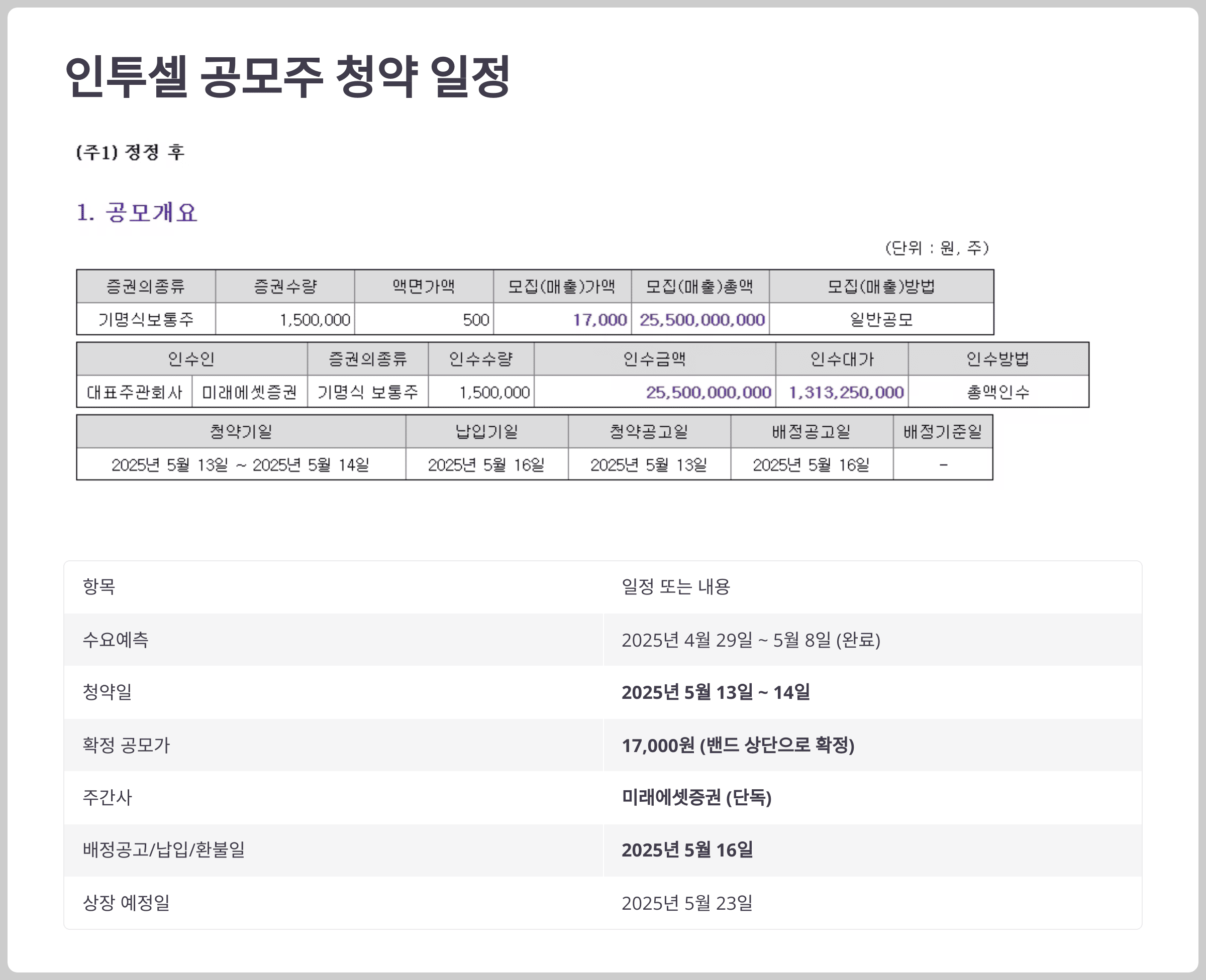 | 수요예측 | 2025년 4월 29일 ~ 5월 8일 (완료) |