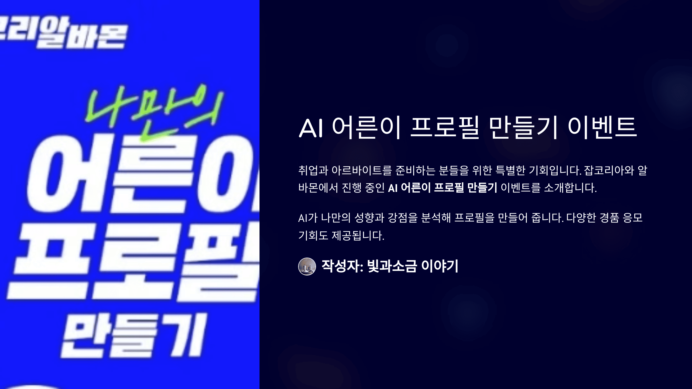 잡코리아 알바몬 토스퀴즈 어른이 프로필 만들기 ai 이벤트입니다. 취업과 아르바이트를 준비하면서 자신만의 강점과 성향을 잘 드러낼 수 있는 방법을 찾고 있다면 잡코리아와 알바몬에서 진행 중인 ‘AI 어른이 프로필 만들기’ 에 주목해 보세요.