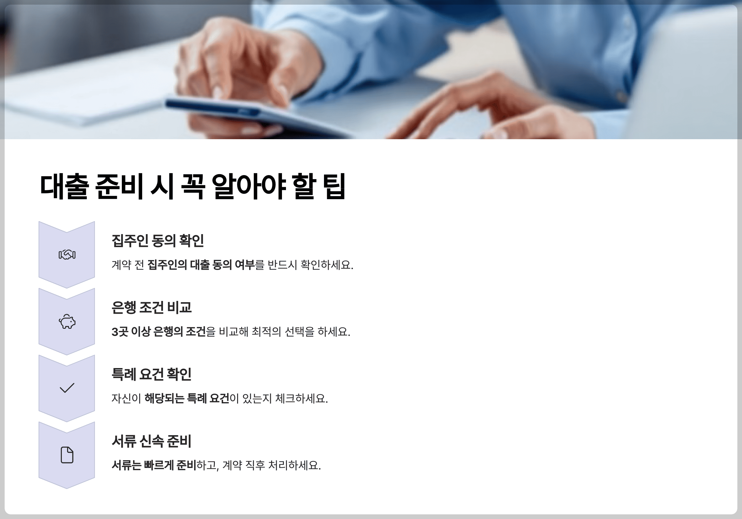 하지만 성공적인 대출을 위해선 자격 요건 파악, 집주인 협의, 은행 조건 비교, 서류 준비가 반드시 선행되어야 해요.