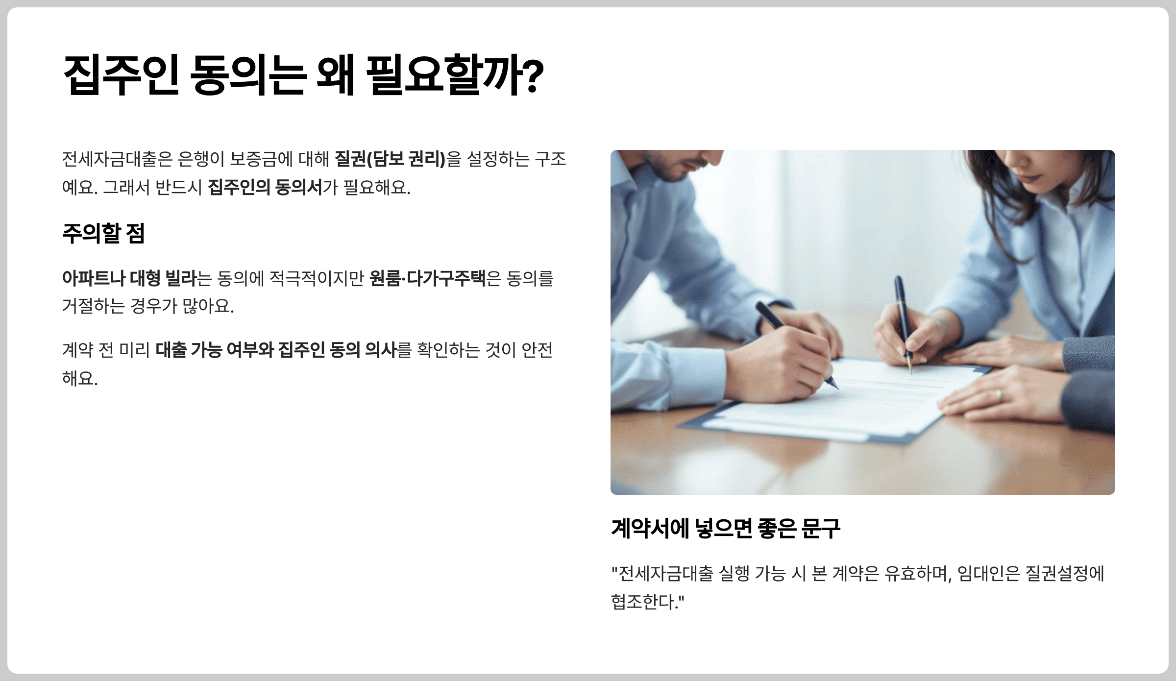원룸·다가구주택은 동의를 거절하는 경우가 많아요. - 계약 전 미리 대출 가능 여부와 집주인 동의 의사를 확인하는 것이 안전해요.