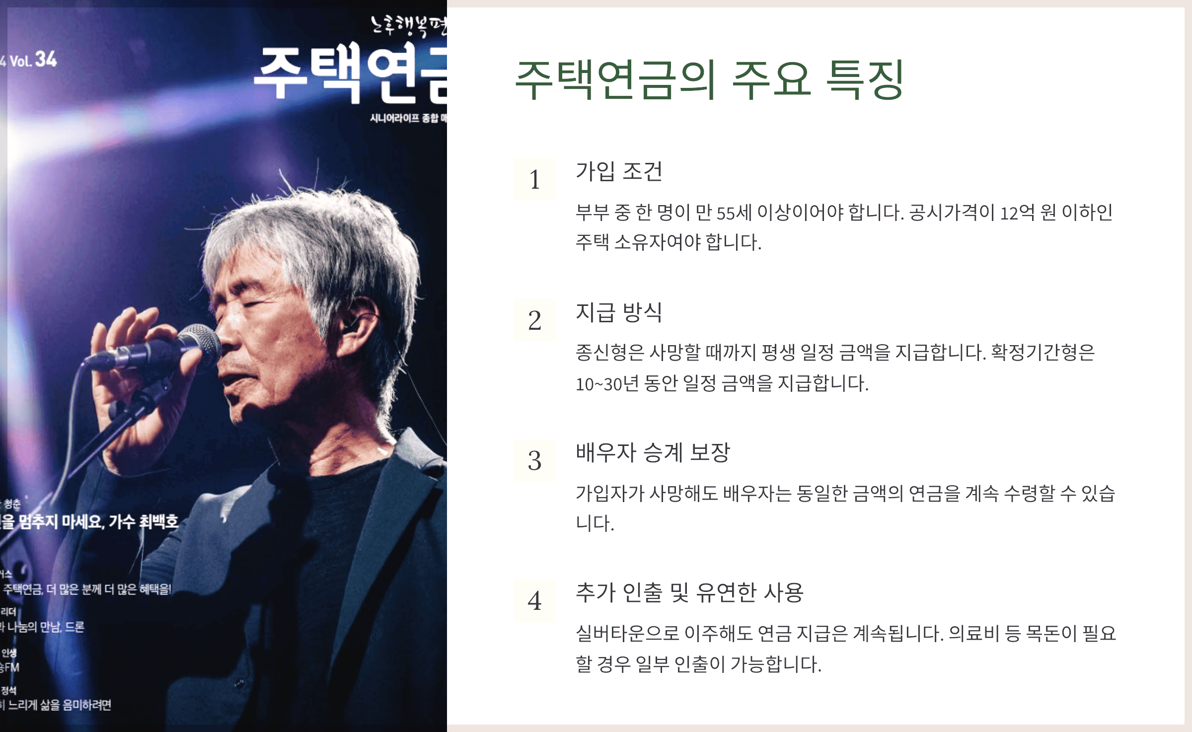 고령층이 보유한 주택을 담보로 매달 안정적인 소득을 보장하는 주택연금은 다음과 같은 특징이 있습니다.