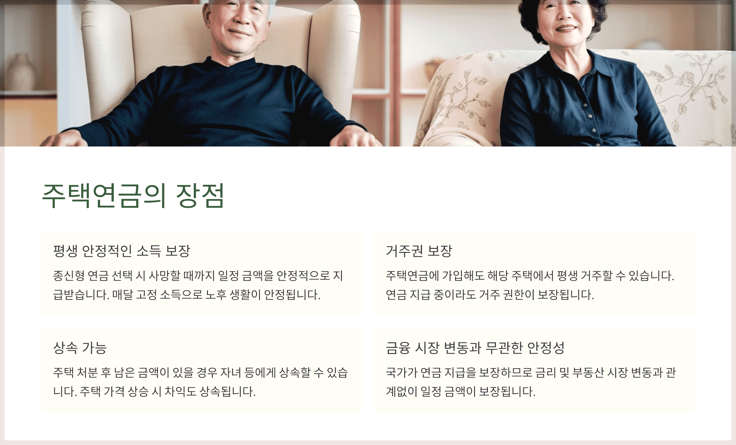 - 국가가 연금 지급을 보장하기 때문에 금리 및 부동산 시장 변동과 관계없이 일정 금액 지급 보장