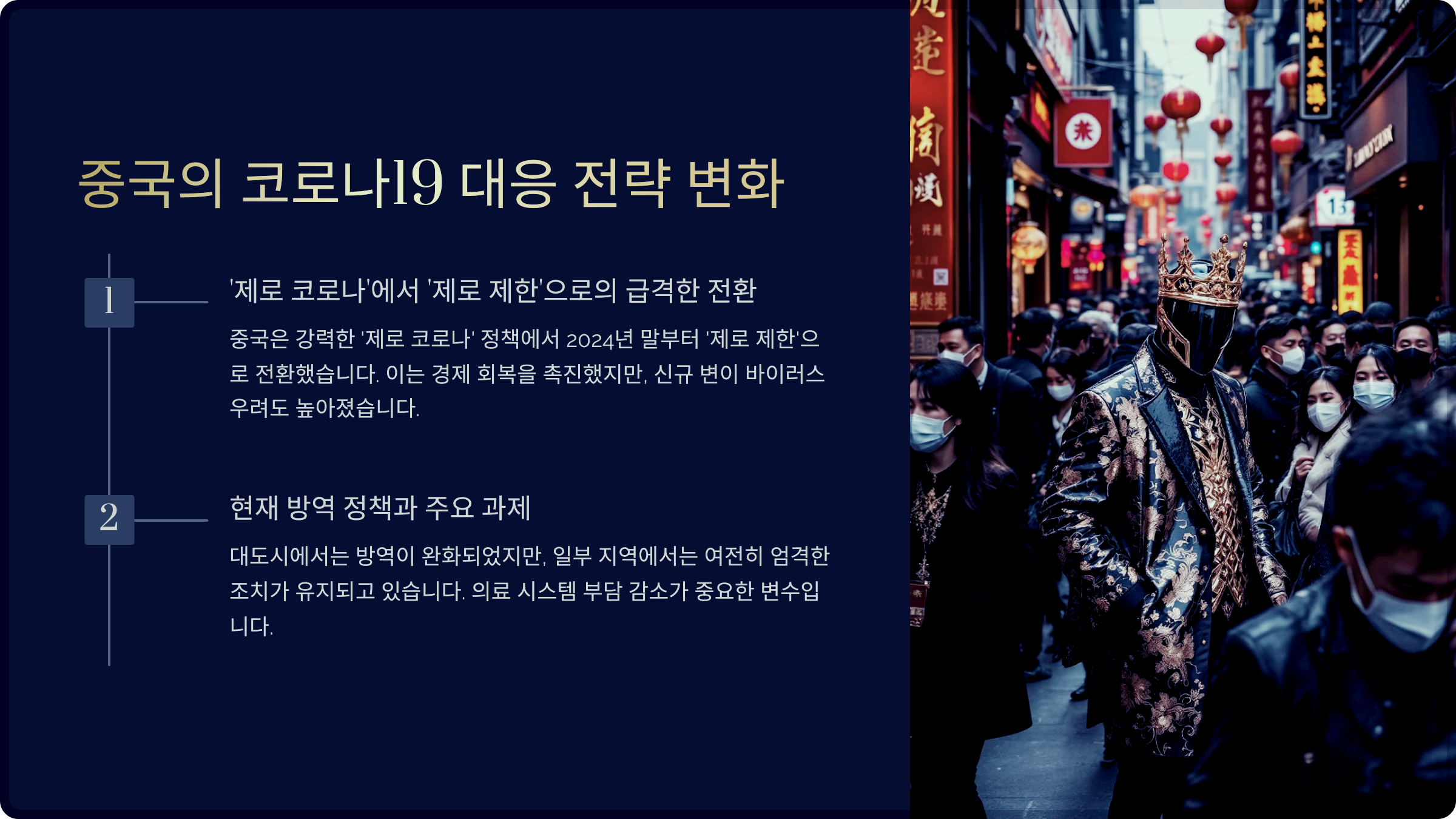 중국은 오랜 기간 동안 강력한 '제로 코로나' 정책을 유지하며 지역 봉쇄, 대규모 PCR 검사, 여행자 격리 등의 강도 높은 방역 조치를 시행했다. 하지만 경제 위축과 사회적 반발이 커지면서 2024년 말부터 방역 정책을 대폭 완화하며 사실상 '제로 제한'으로 전환했다.