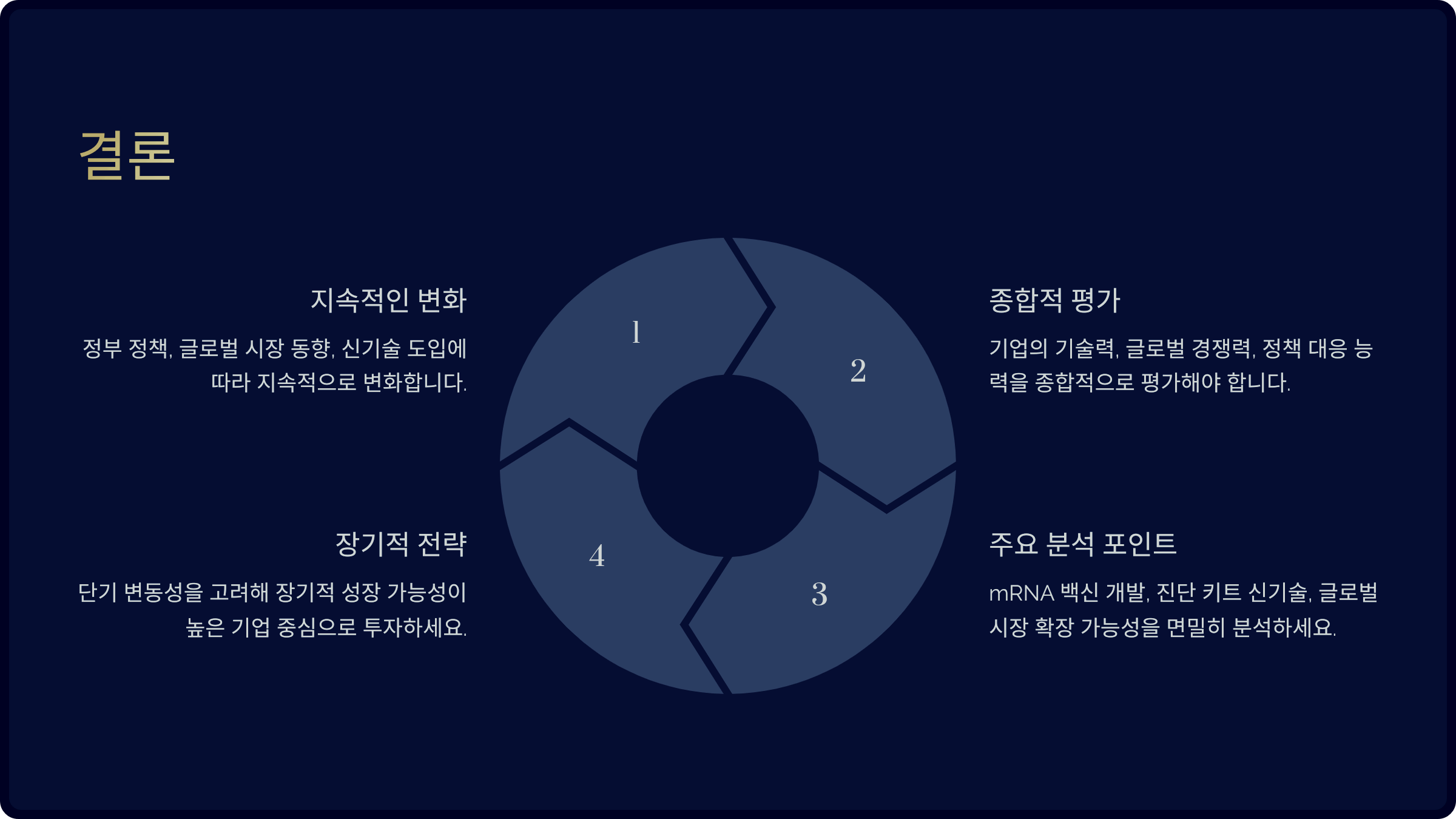 특히 mRNA 백신 개발, 진단 키트의 신기술 도입, 글로벌 시장 확장 가능성을 면밀히 분석하는 것이 중요하다. 단기적으로는 변동성이 클 수 있으므로, 장기적인 성장 가능성이 높은 기업을 중심으로 투자 전략을 세우는 것이 바람직하다.