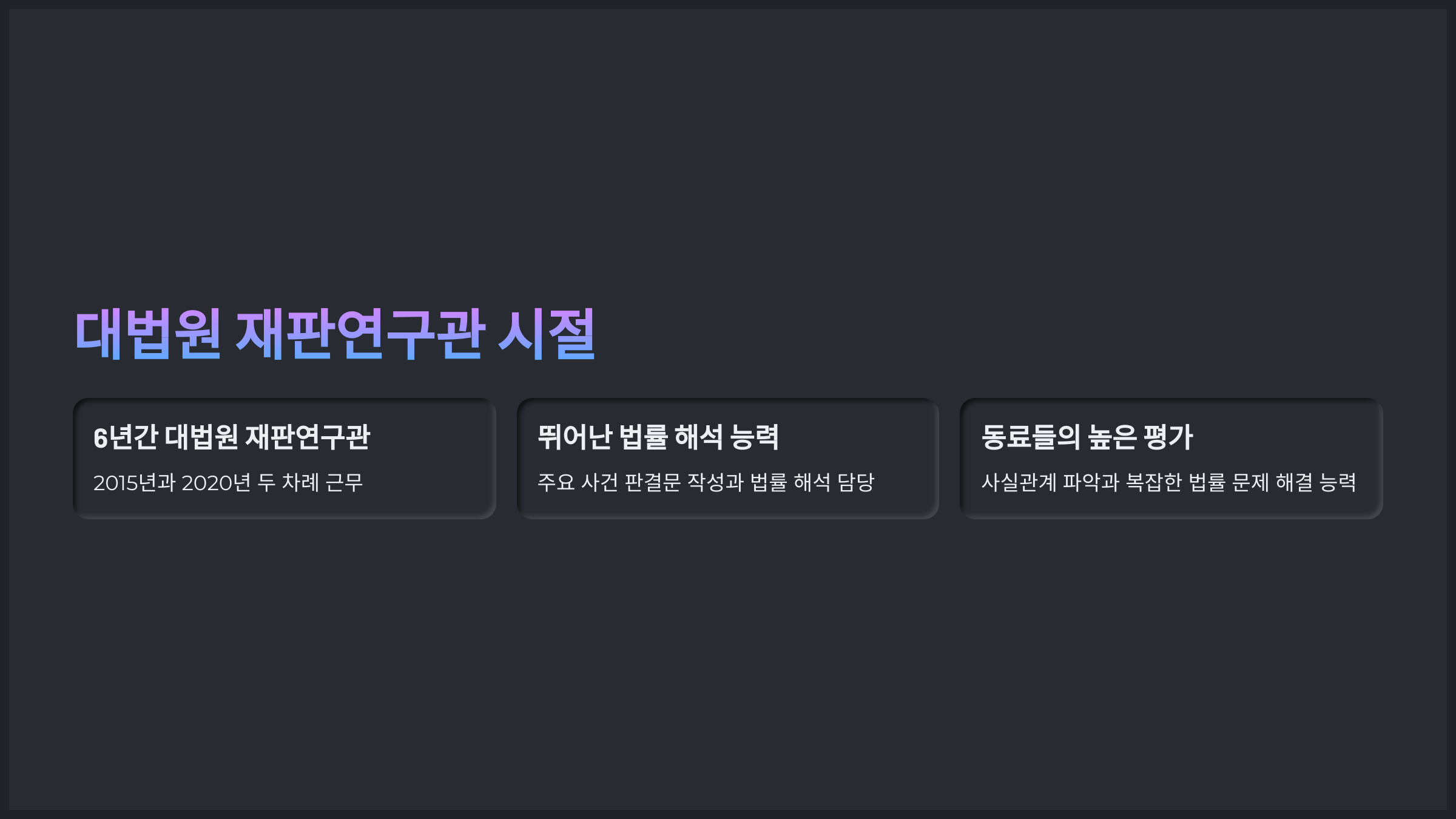 - 대법원 재판연구관으로 근무하며 법률의 세부 사항까지 정확하게 해석하고 적용하는 능력을 인정받았습니다.